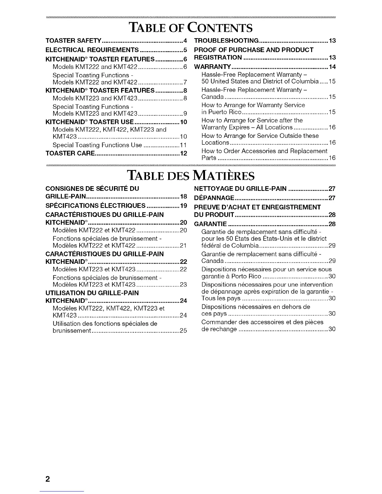 KITCH ENAID ®TOASTER USE .......................... 10