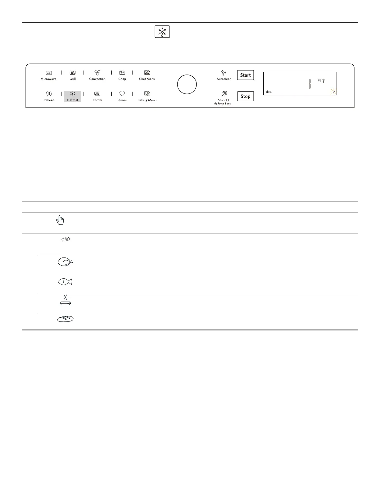 Use this function to defrost Meat, Poultry, Fish, Vegetables or Bread.