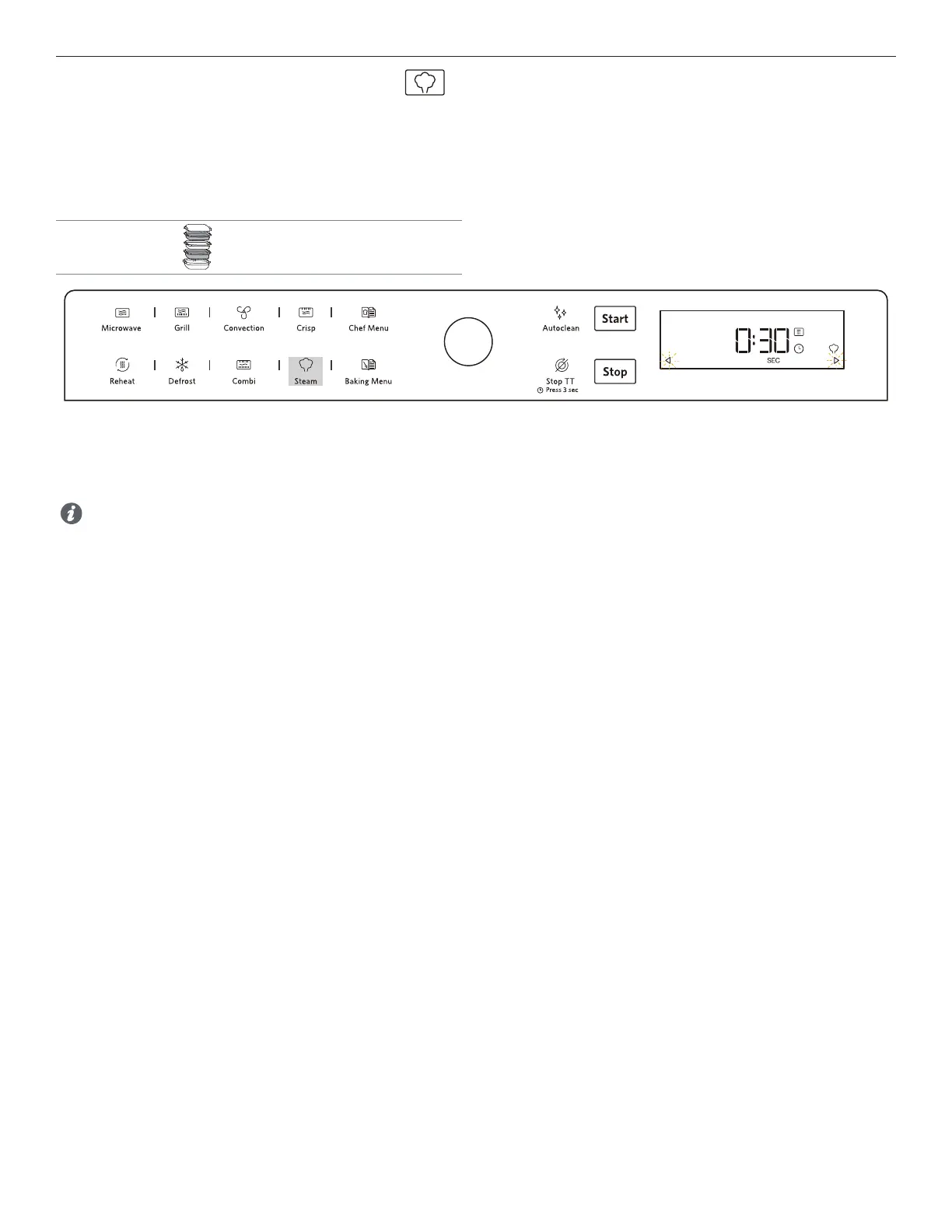 This function allows you to obtain healthy and natural tasting dishes by cooking with steam. Use this function to steam cook foods