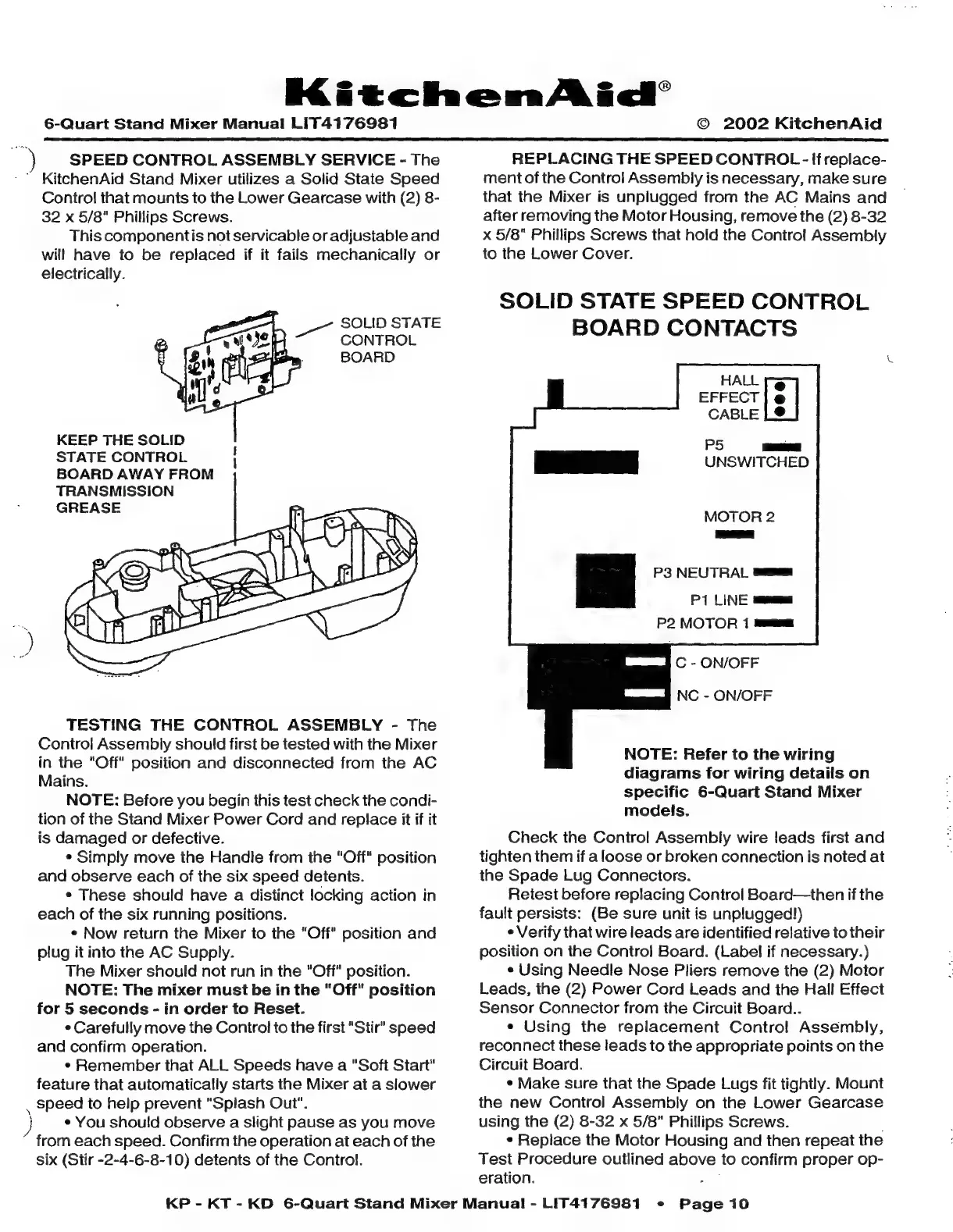 KitchenAid KP - Speed Control Assembly Service and Testing; Replacing the Mixer Speed Control Board; Testing the Mixer Control Assembly