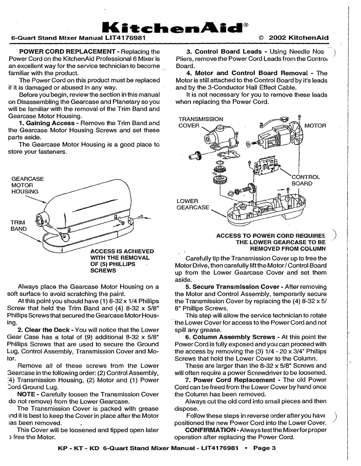 KitchenAid KP - Replacing the Stand Mixer Power Cord
