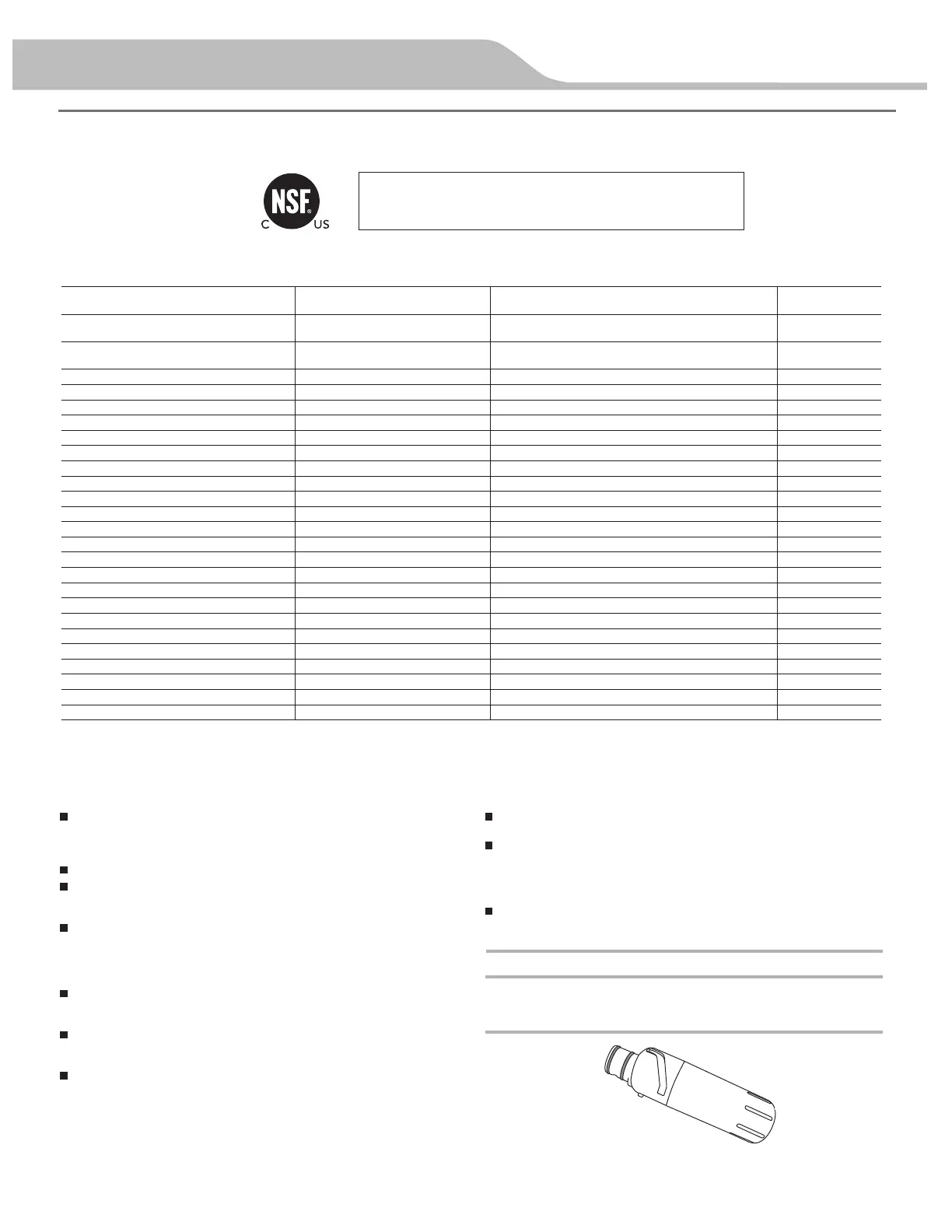 Ce produit a été testé selon les normas NSF/ANSI 42, 53 et 401 pour la réduction des substances énumérées ci-dessous. La