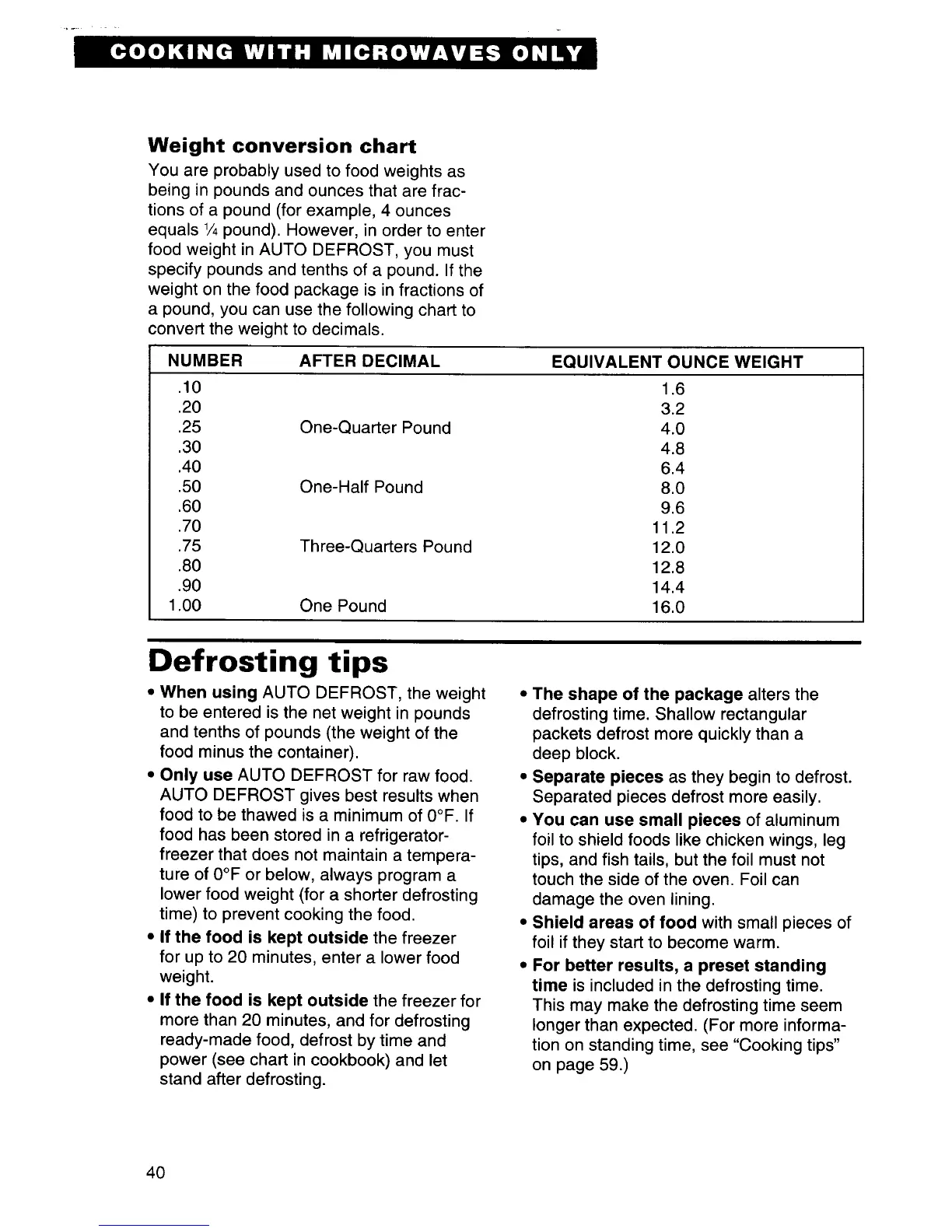 KitchenAid Krisp - Weight Conversion Chart; Defrosting Tips