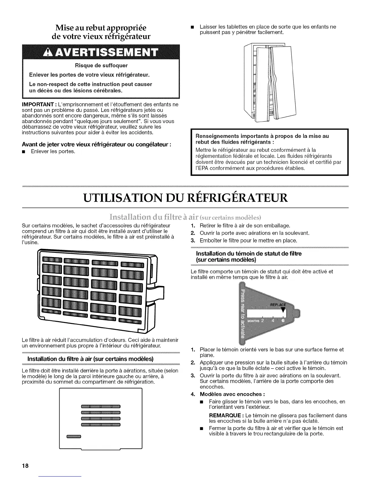 refrig6rateur. Sur certains modeles, le filtre & air est preinstall6 &