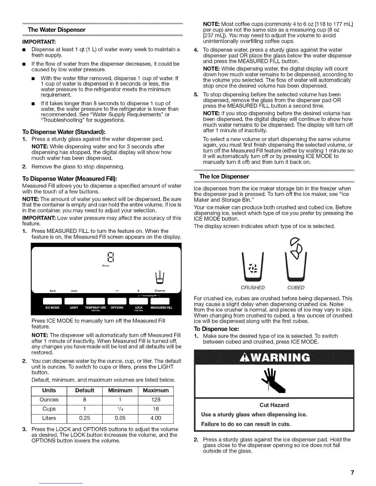 NOTE: The amount of water you select will be dispensed. Be sure
