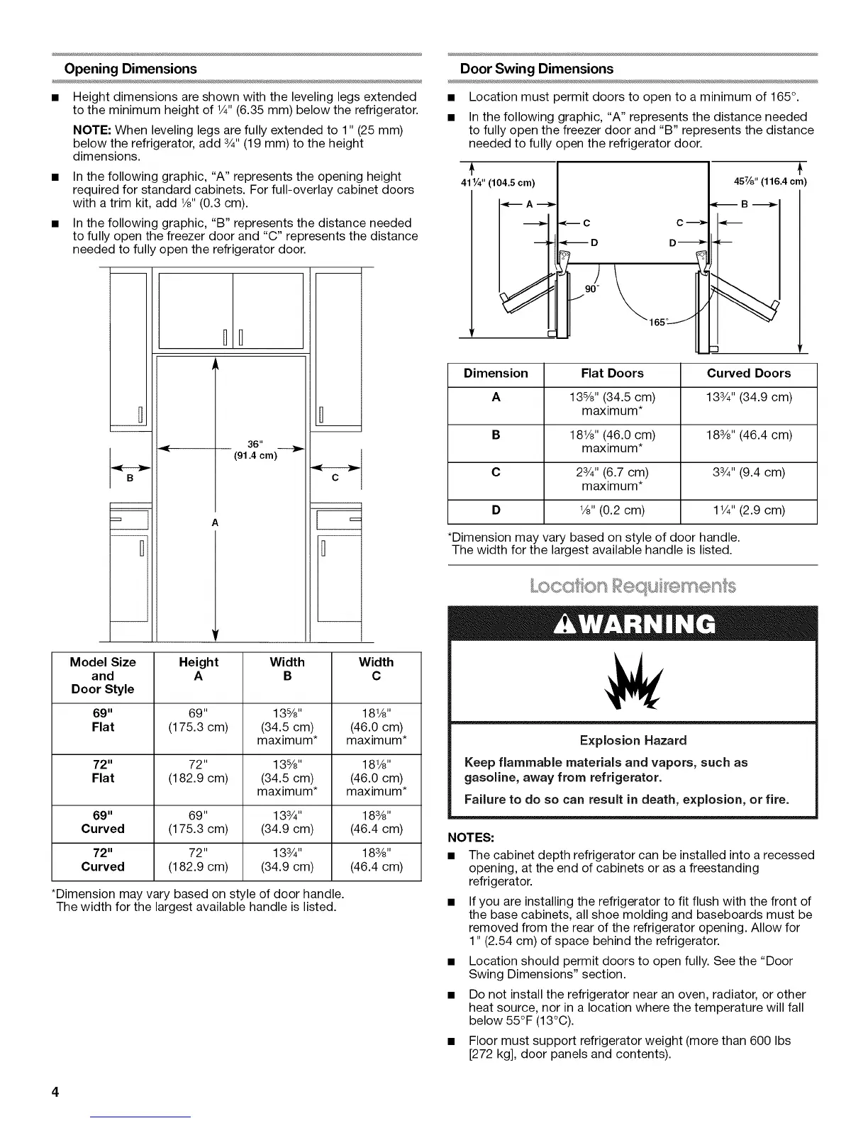 KitchenAid KSC24C8EYW02 - Location Requirements; Opening Dimensions; Door Swing Dimensions