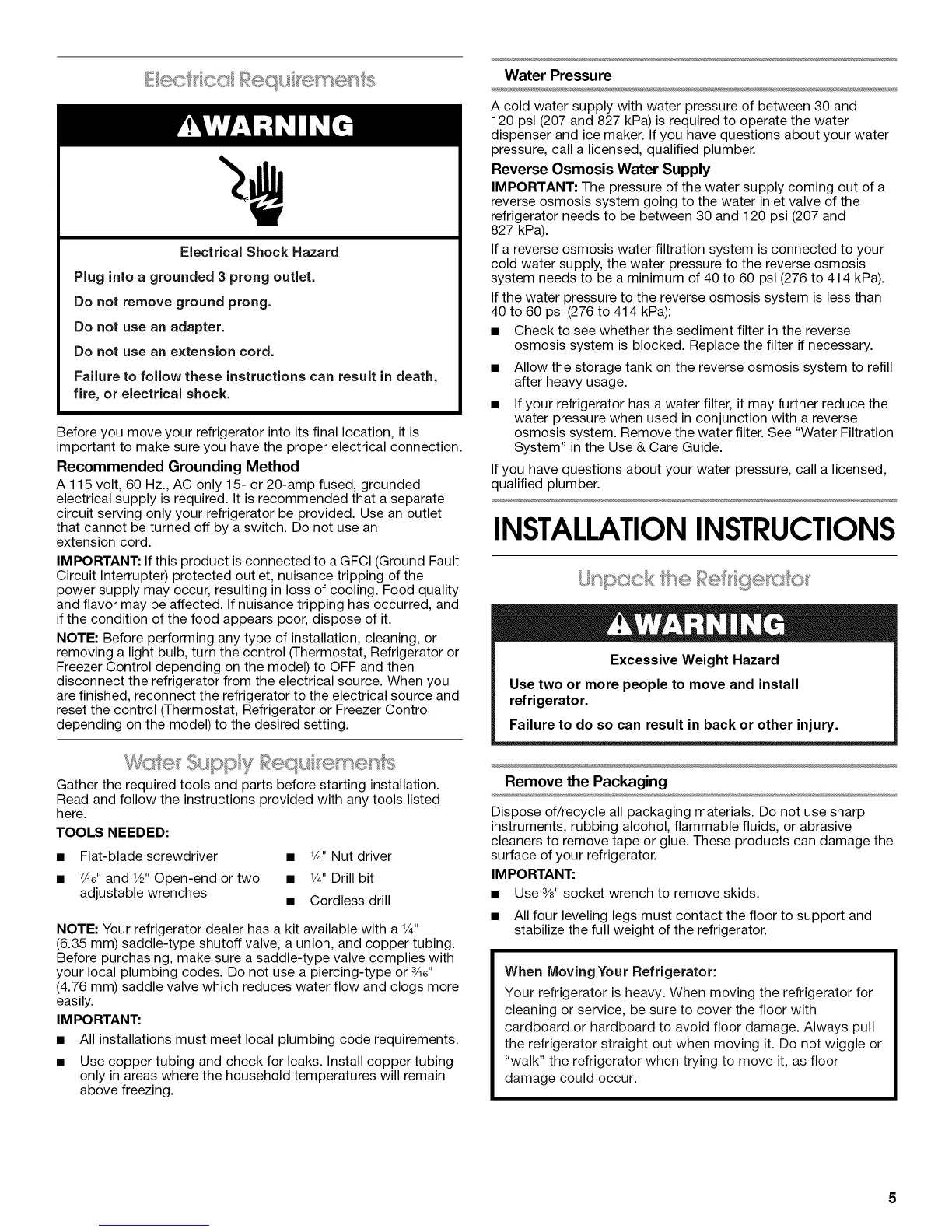 KitchenAid KSC24C8EYW02 - Installation Instructions; Electrical Requirements; Water Supply Requirements; Unpacking