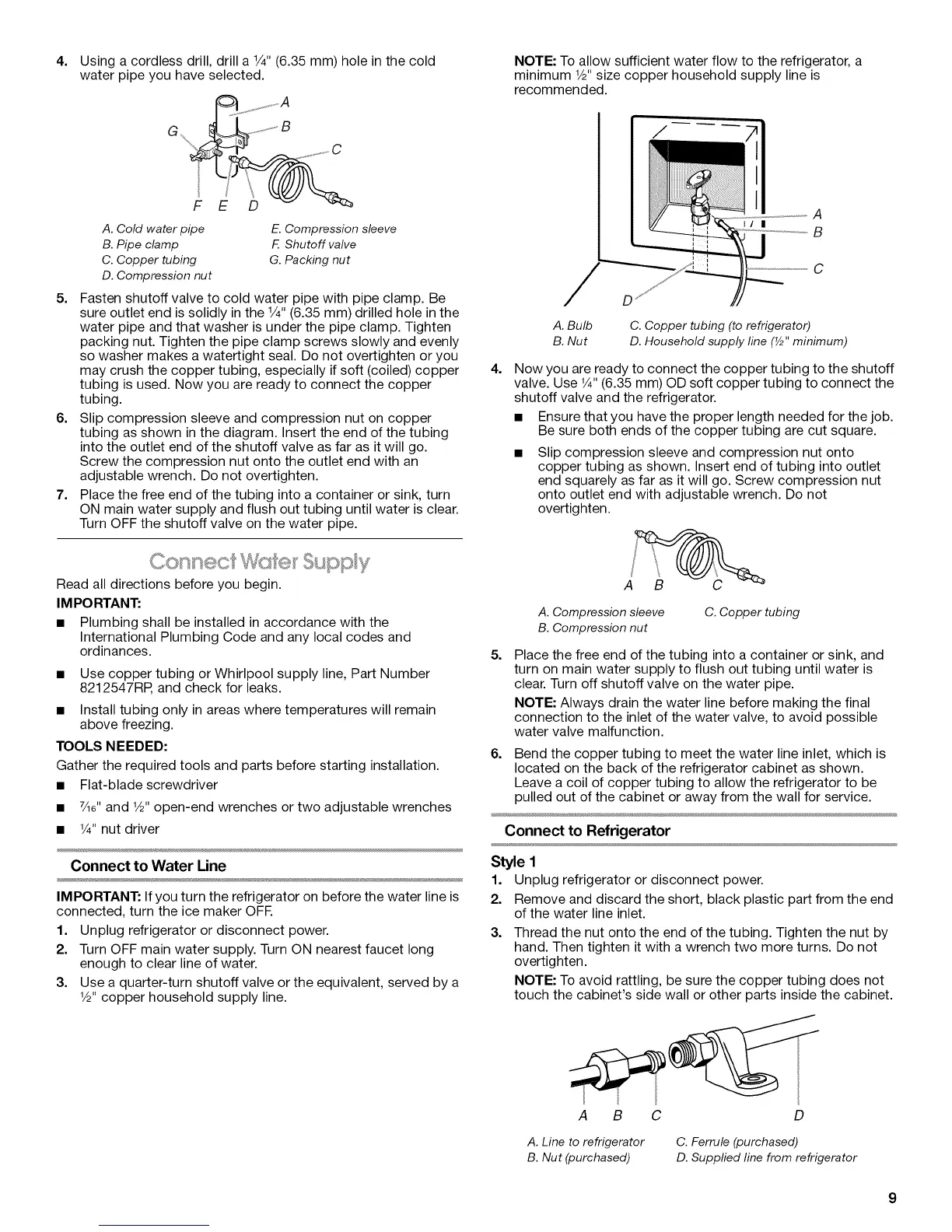KitchenAid KSC24C8EYW02 - Connect Water Supply; Connect to Water Line; Connect to Refrigerator