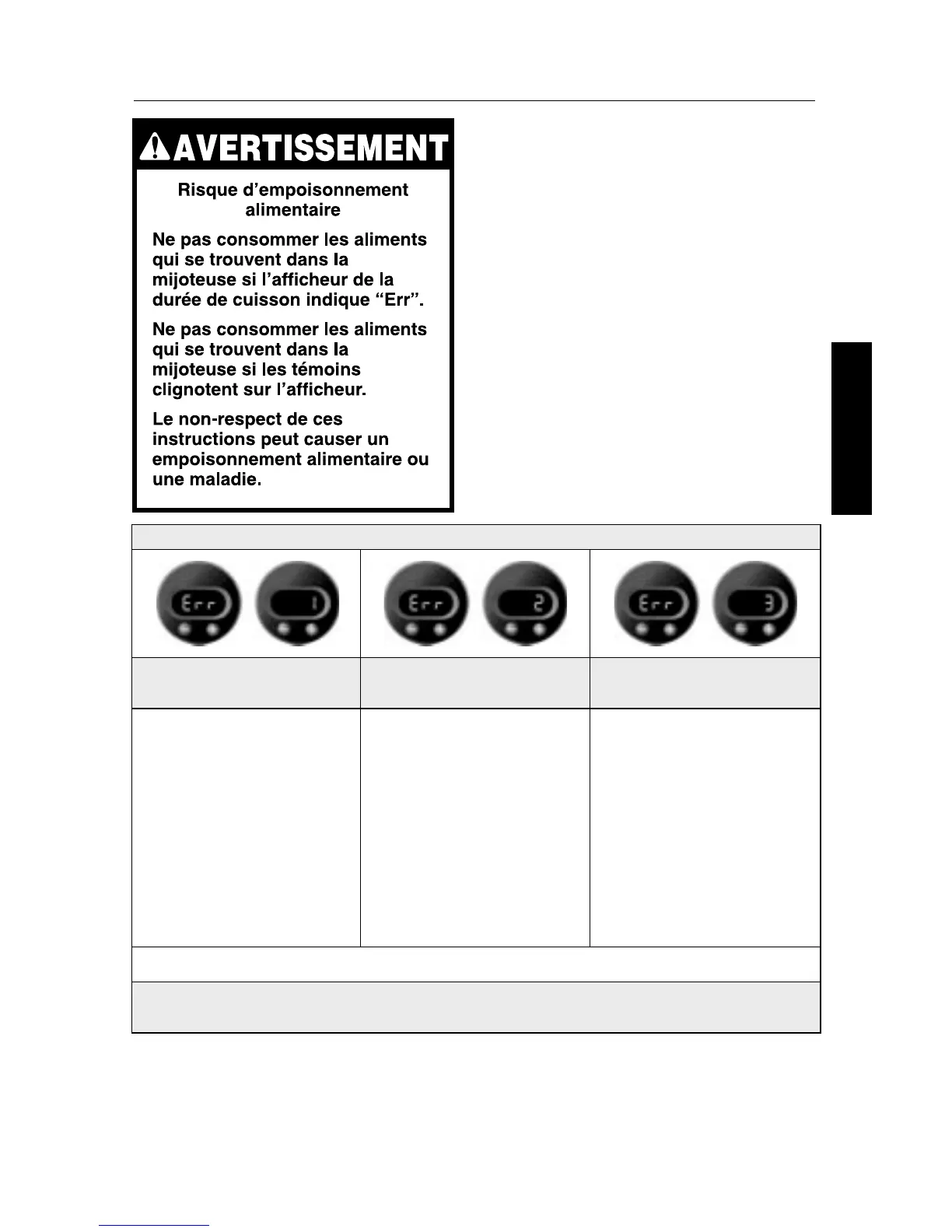 • Tous les codes d’erreur : jetez les aliments car ils pourraient ne pas être bien cuits.