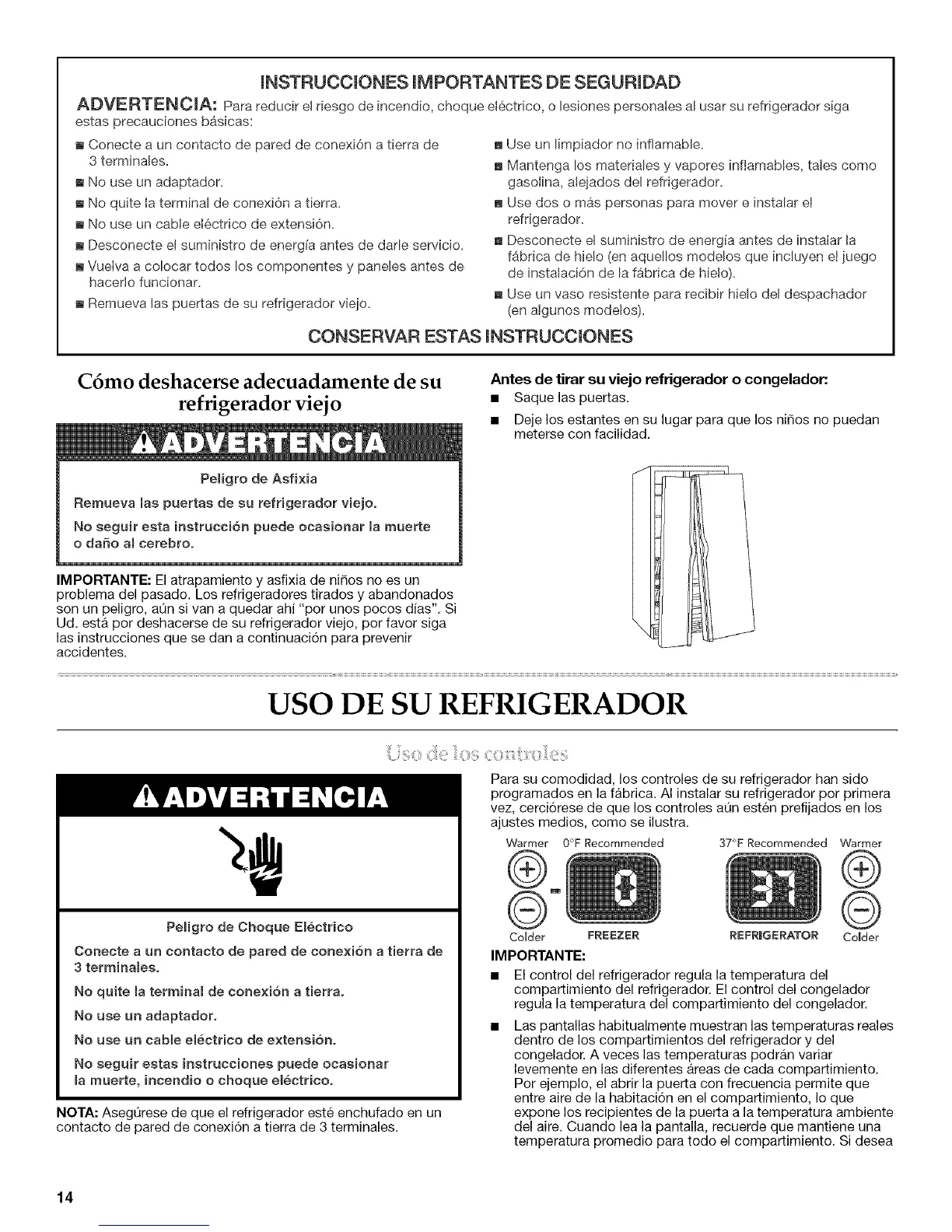 ADVERTENCmA: Para reducir el desgo de incendio, choque electrico, o lesiones personales al usar su refrigerador siga