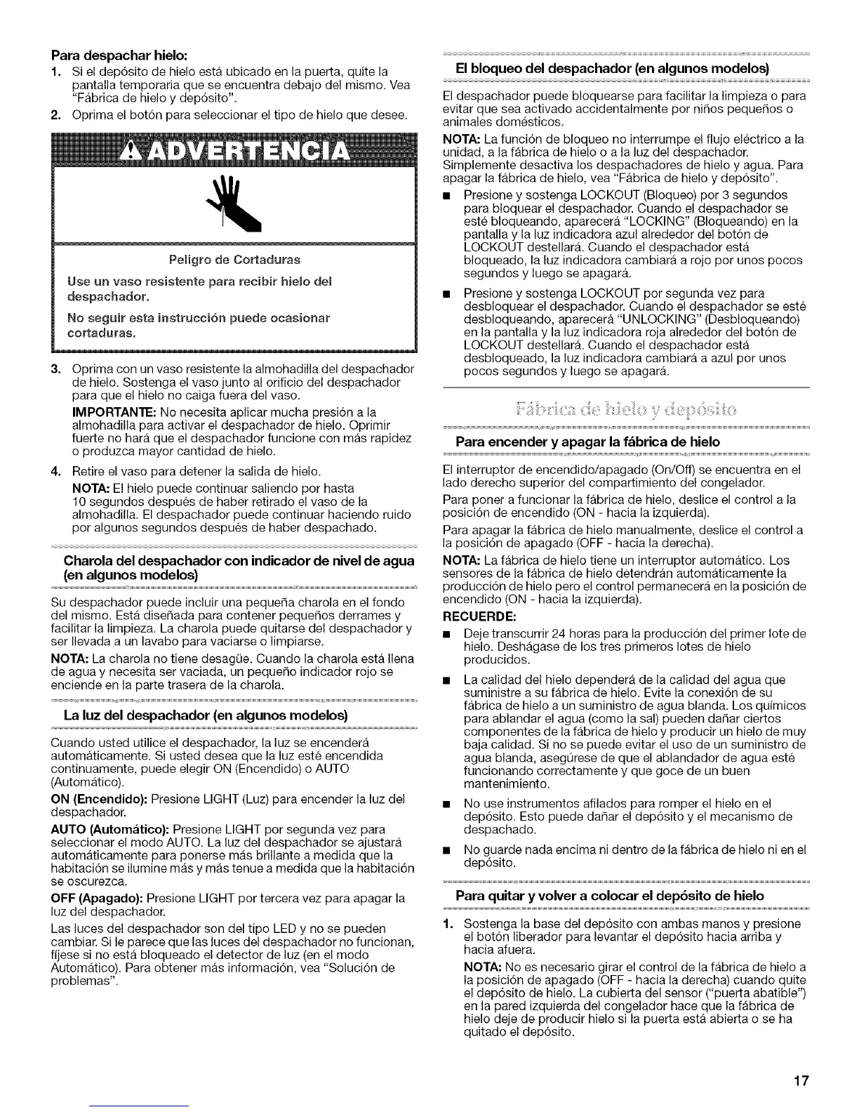 apagar la fabrica de hielo, vea "Fabrica de hielo y dep6sito".