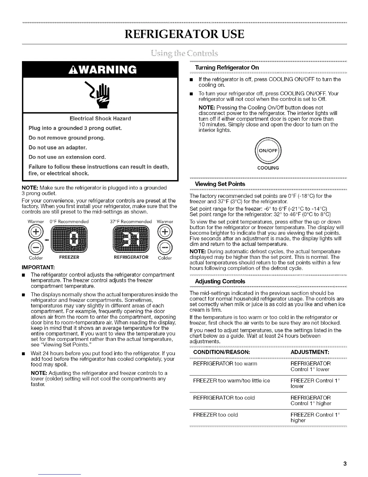 NOTE: Adjusting the refrigerator and freezer controls to a