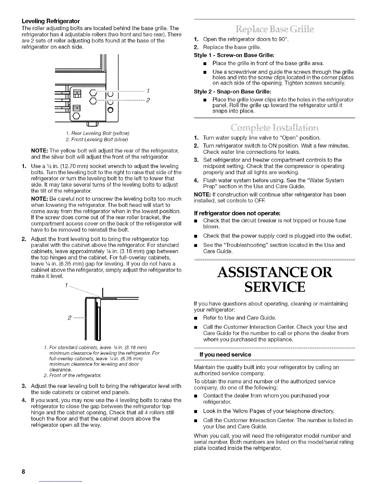 NOTE: The yellow bolt will adjust the rear of the refrigerator,