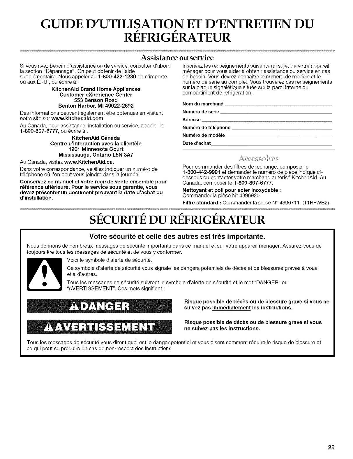 dessous ou contacter votre marchand autorise KitchenAid. Au