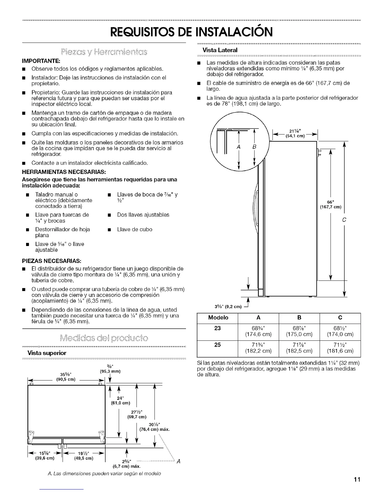 por debajo del refrigerador, agregue 11/8"(29 mm) alas medidas