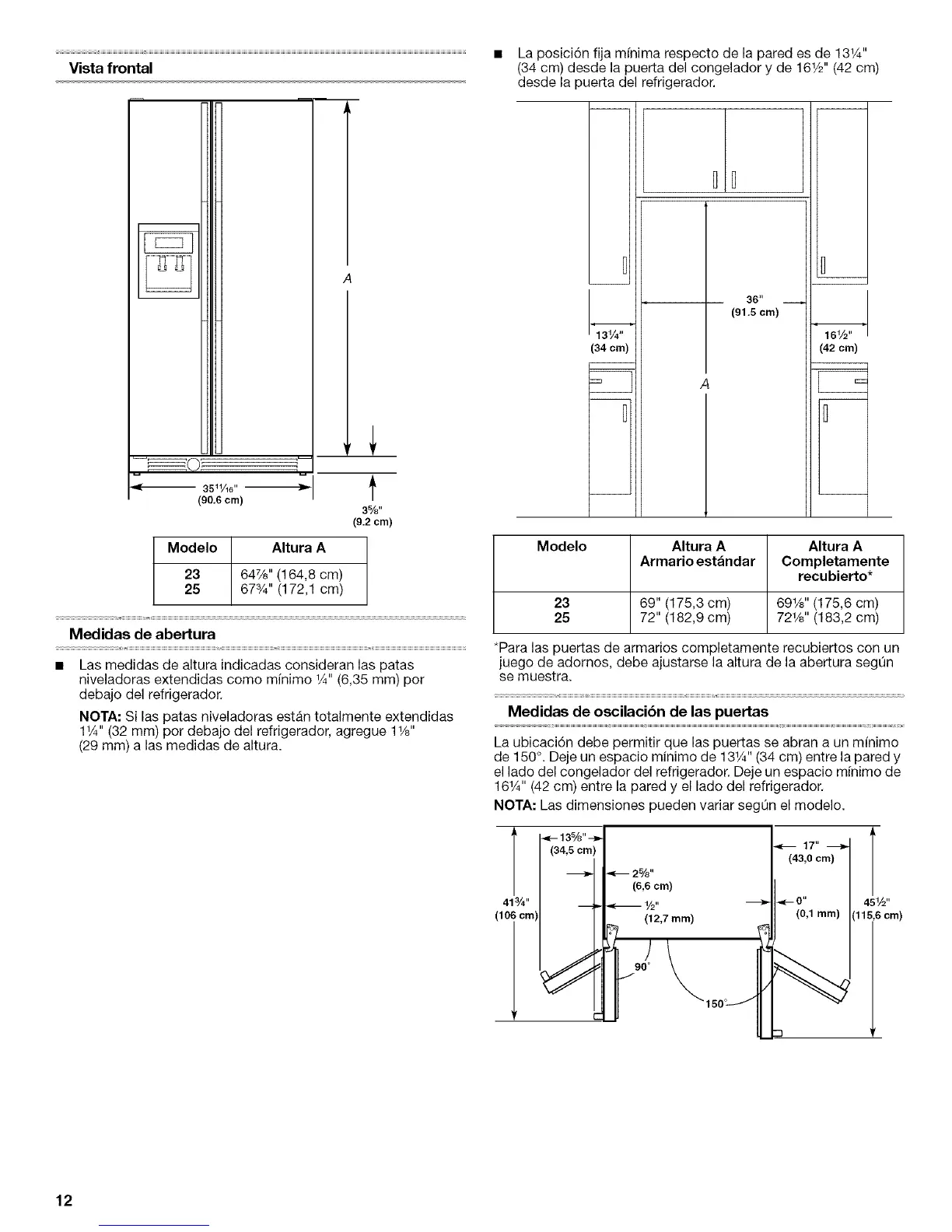 161A" (42 cm) entre la pared y el lado del refrigerador.