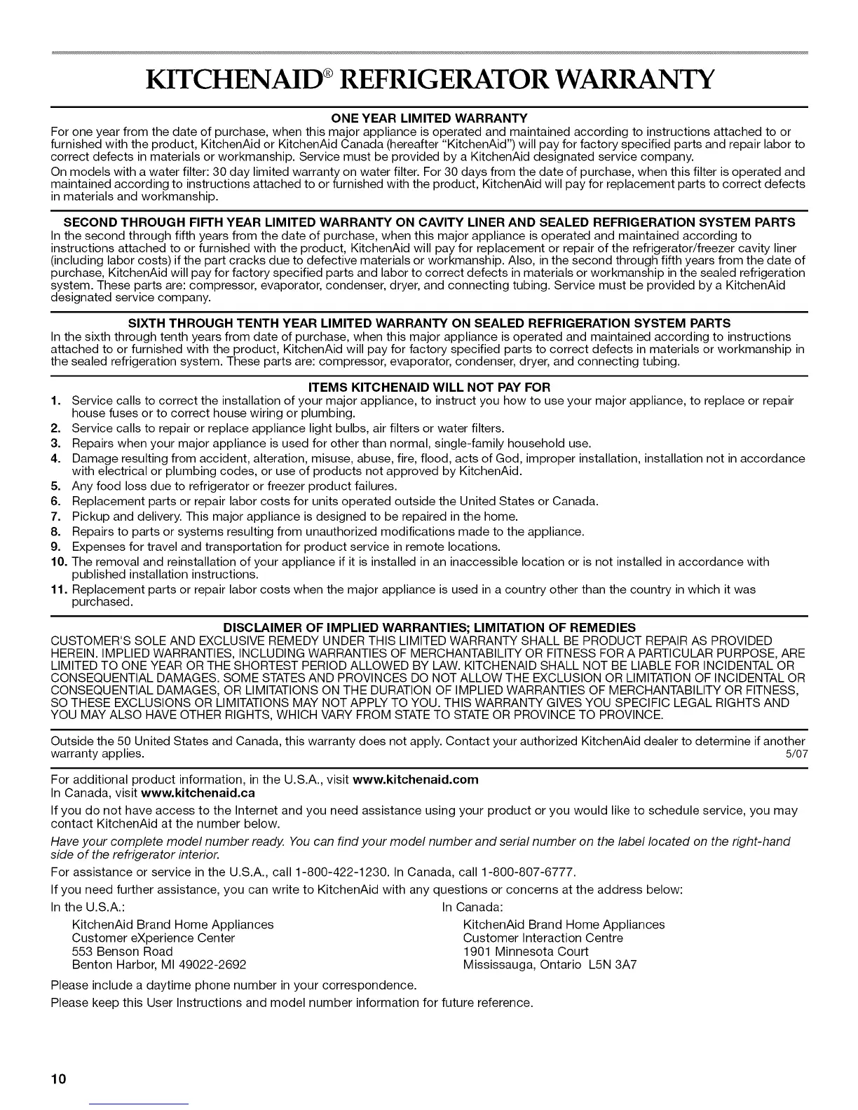 KITCHENAID ®REFRIGERATOR WARRANTY