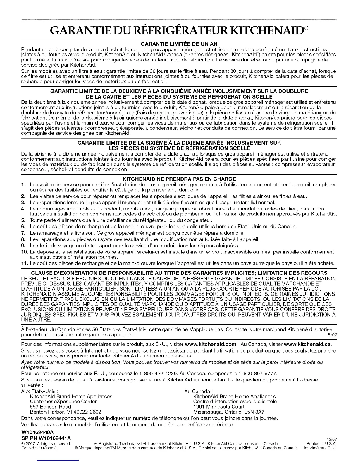 A I'exterieur du Canada et des 50 12tats des 12tats-Unis, cette garantie ne s'applique pas. Contacter votre marchand KitchenAid autorise