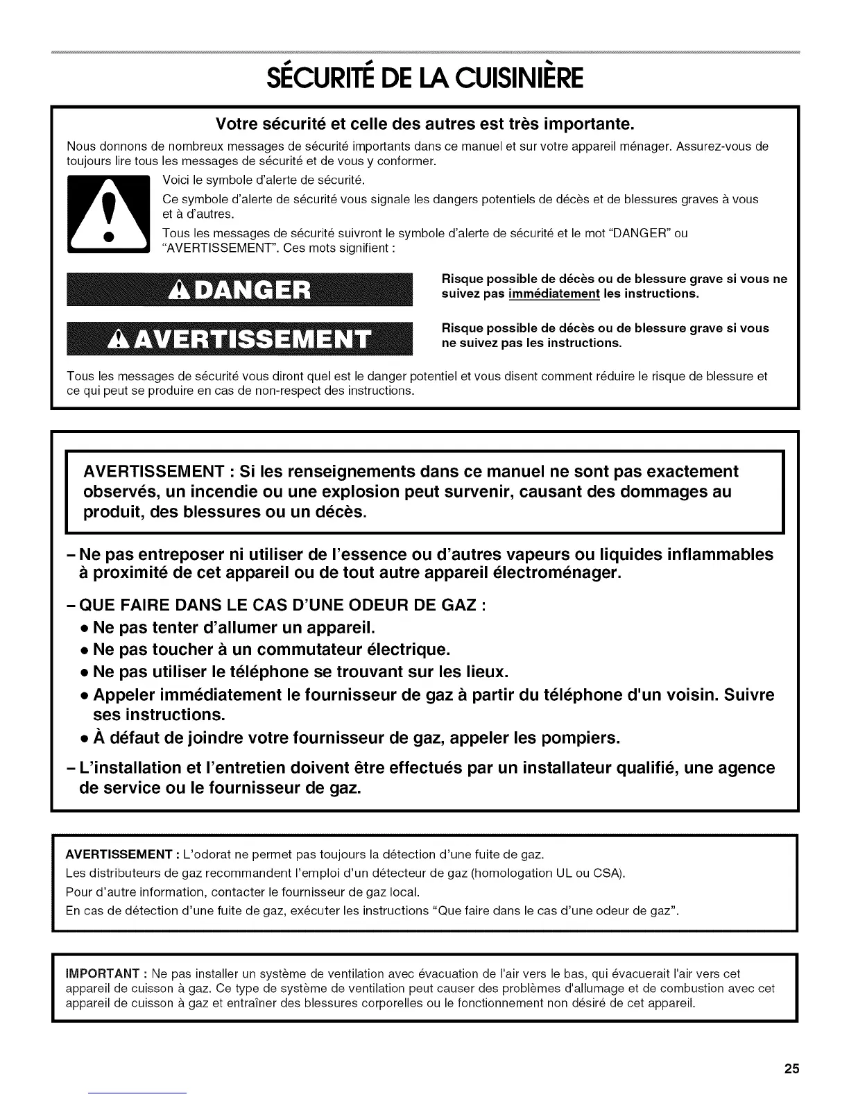 AVERTISSEMENT : L'odorat ne permet pas toujours la detection d'une fuite de gaz.