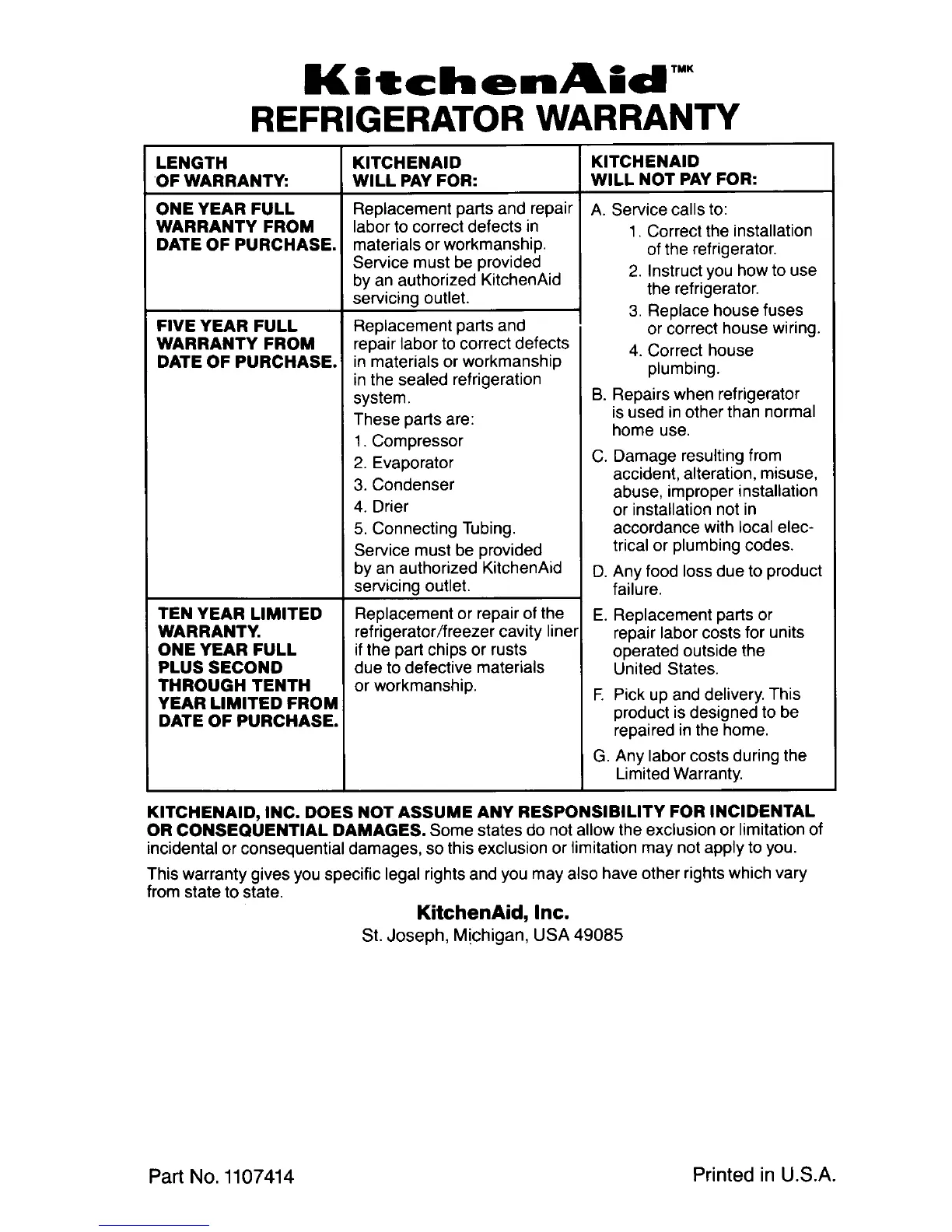 KitchenAid KSRF22D - KITCHENAID REFRIGERATOR WARRANTY; ONE YEAR FULL WARRANTY FROM DATE OF PURCHASE.; FIVE YEAR FULL WARRANTY FROM DATE OF PURCHASE.; TEN YEAR LIMITED WARRANTY. ONE YEAR FULL PLUS SECOND THROUGH TENTH YEAR LIMITED FROM DATE OF PURCHASE.