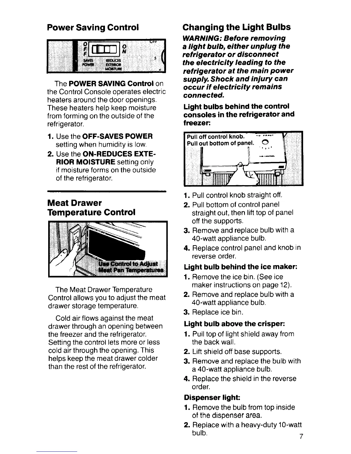 KitchenAid KSRF22D - Power Saving Control; Meat Drawer Temperature Control; Changing the Light Bulbs