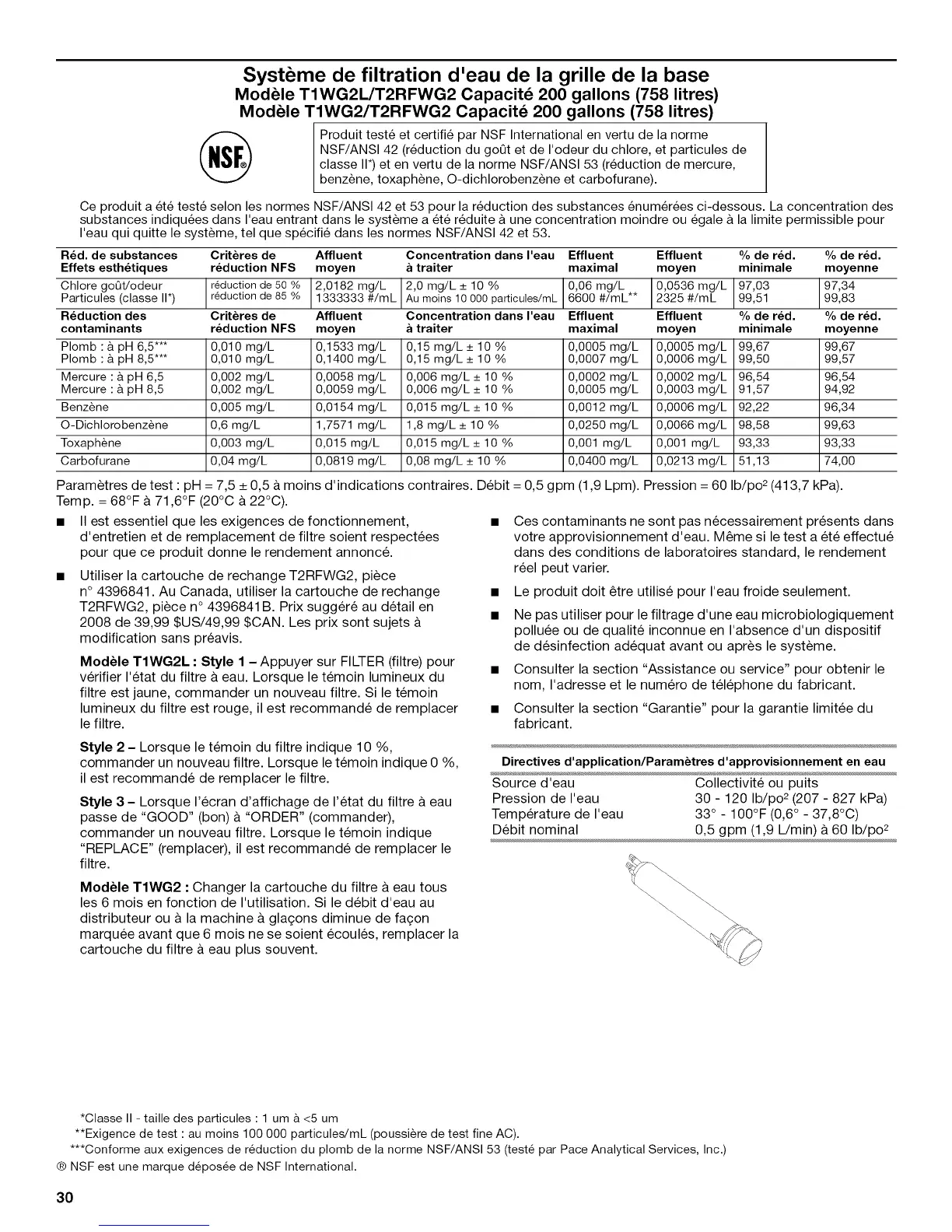Ce produit a et6 teste selon les normes NSF/ANSI 42 et 53 pour la reduction des substances 6num@ees ci-dessous. La concentration des