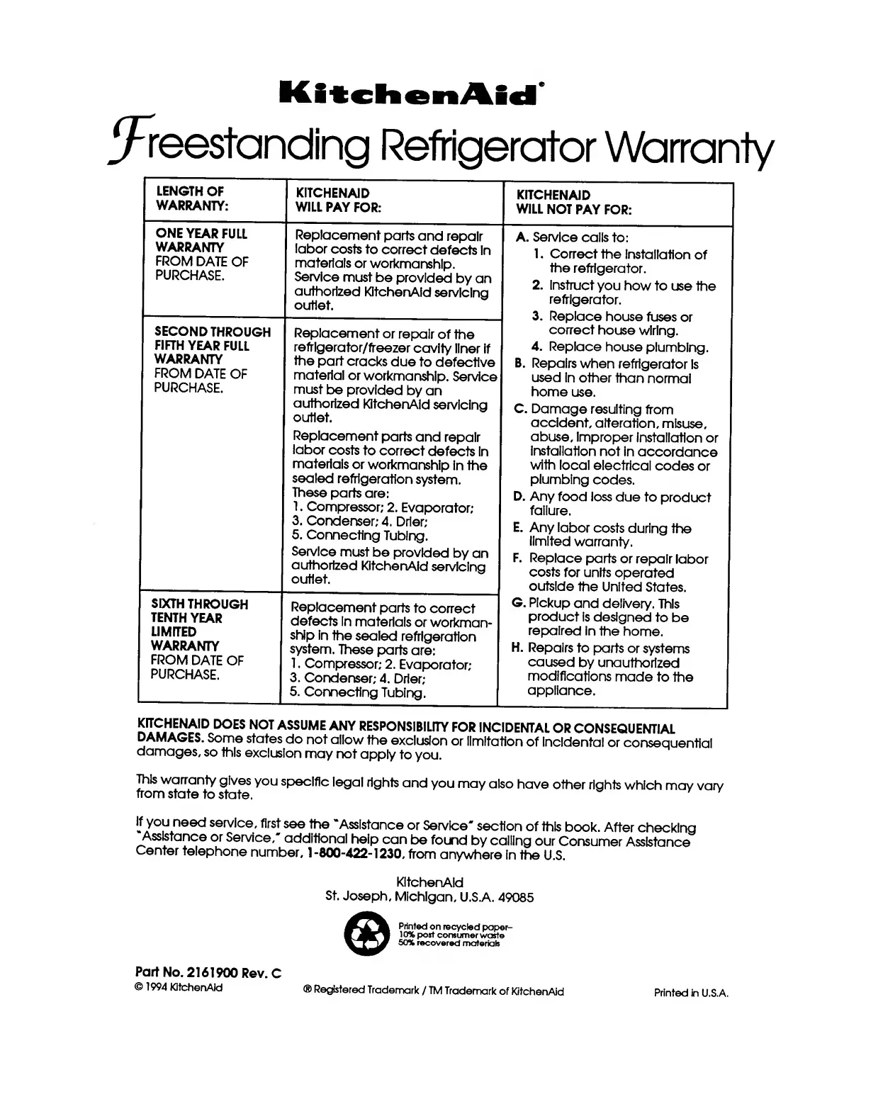 KitchenAid KSRS22Q - KitchenAid Refrigerator Warranty Details