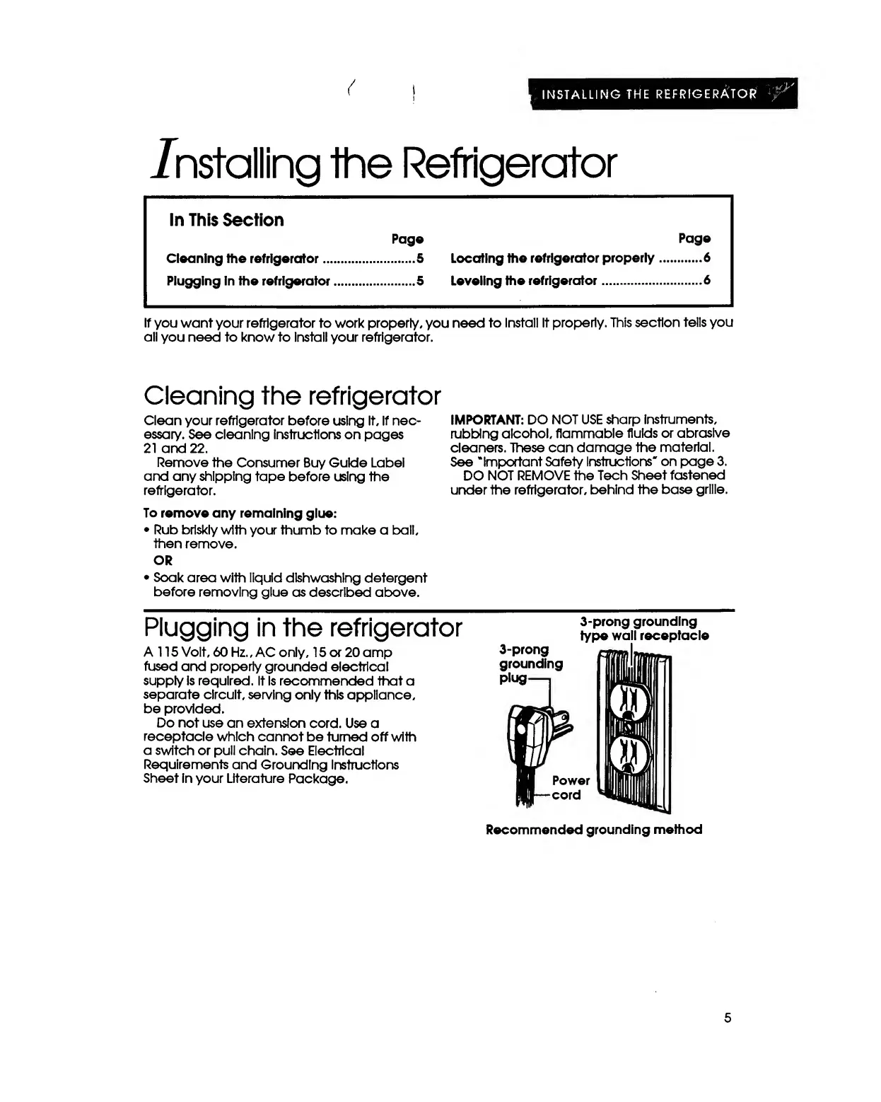 KitchenAid KSRS22Q - Refrigerator Installation Guide; Pre-Installation Cleaning; Electrical Hookup