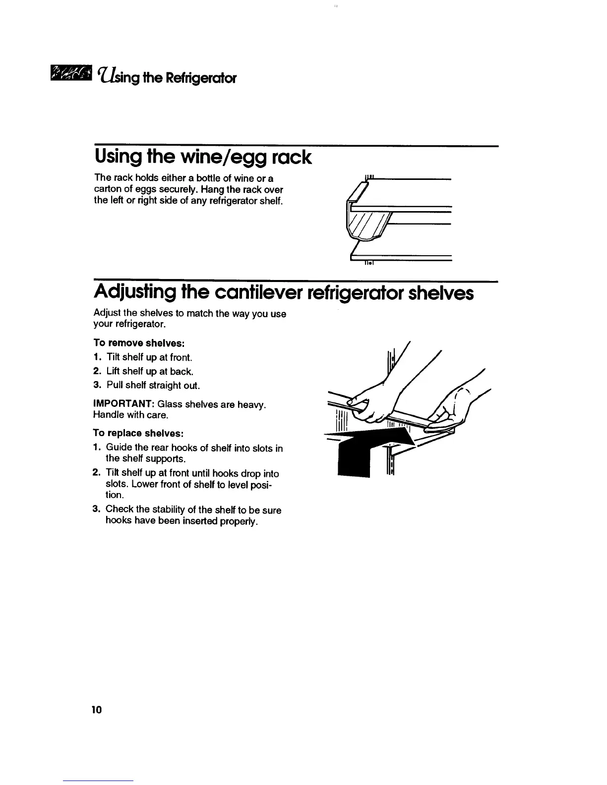 KitchenAid KSRS25F - Specialty Refrigerator Storage Features; Using the Wine and Egg Rack; Adjusting Cantilever Shelves
