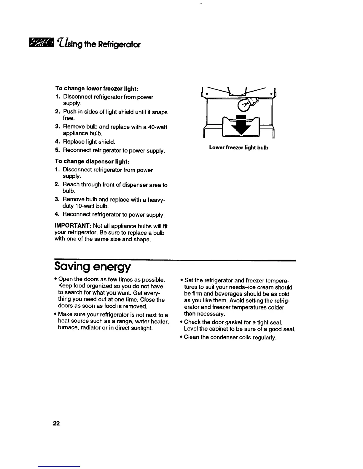 KitchenAid KSRS25F - Freezer and Dispenser Lighting; Replacing Lower Freezer Light; Replacing Dispenser Area Light; Energy Saving Tips