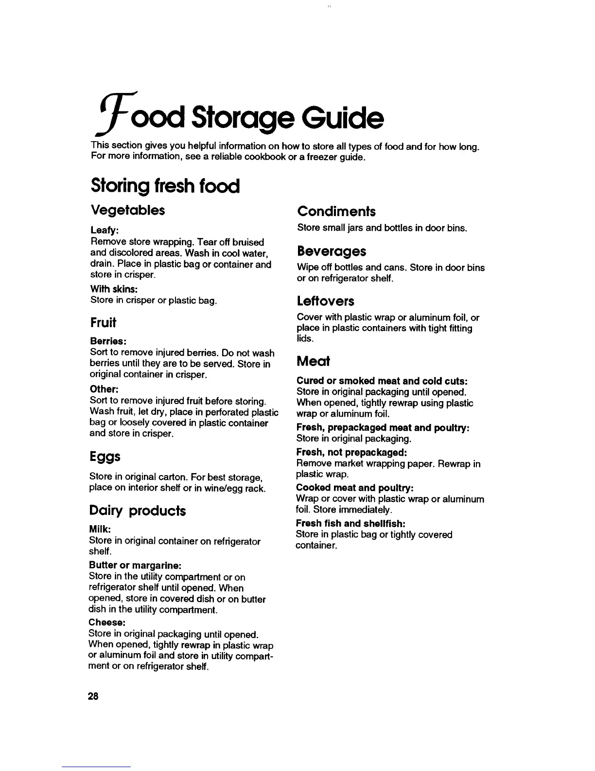 KitchenAid KSRS25F - Fresh Food Storage Guide; Storing Fresh Vegetables and Fruits; Storing Dairy Products, Eggs, and Meats; Storing Condiments, Beverages, and Leftovers