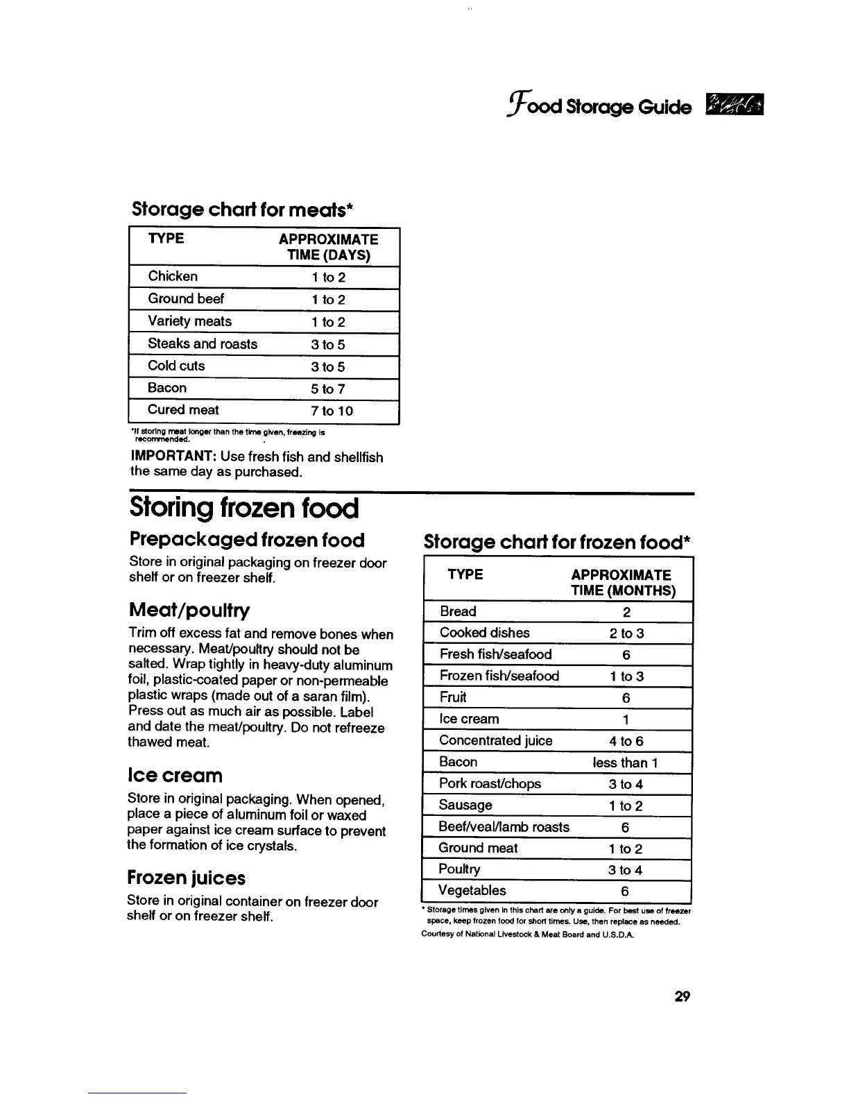 KitchenAid KSRS25F - Food Storage Charts; Fresh Meat Storage Times; Frozen Food Storage Times