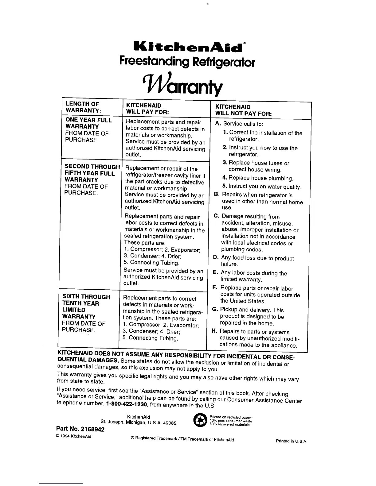 KitchenAid KSRS25F - KitchenAid Refrigerator Limited Warranty; Warranty Coverage and Exclusions; Warranty Terms and Limitations