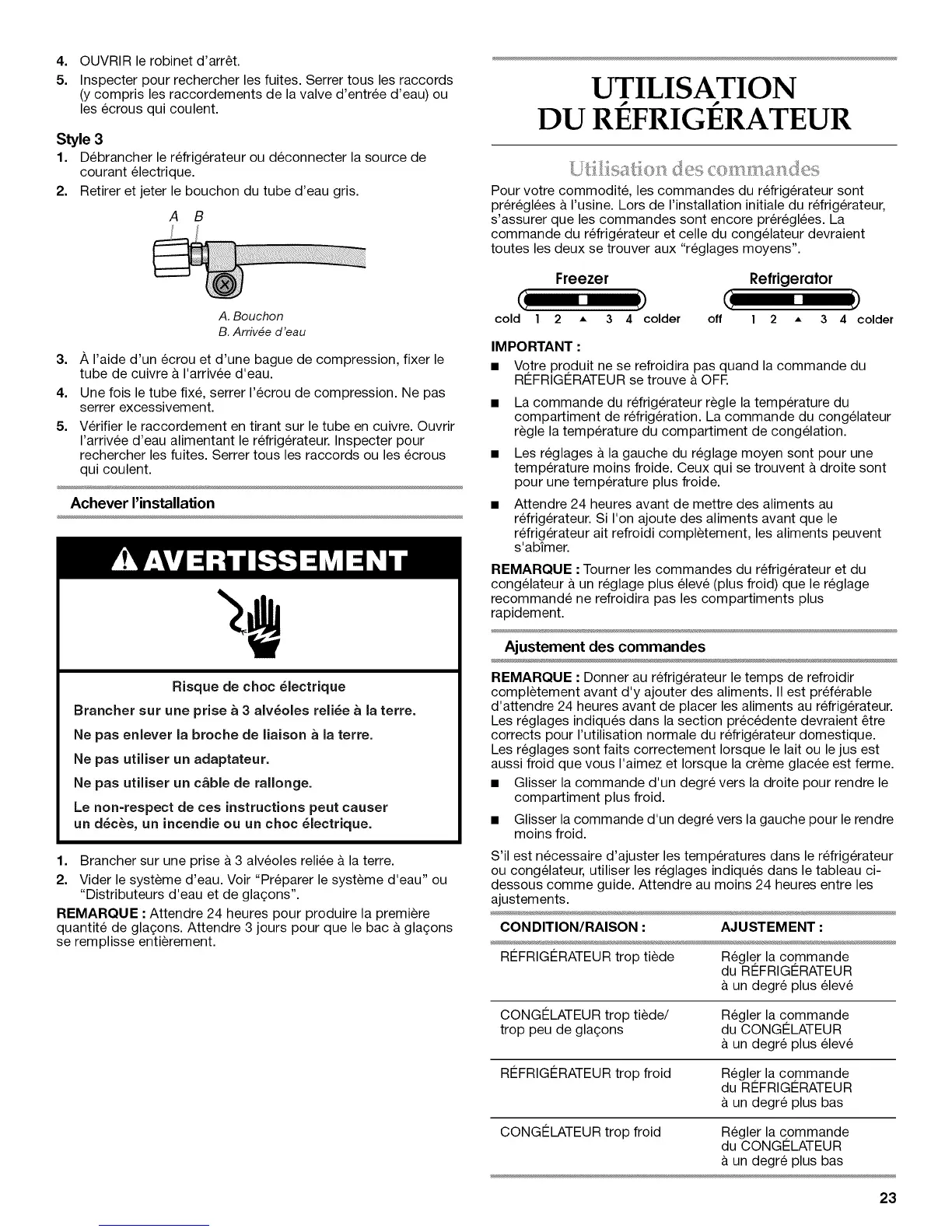 REMARQUE :Tourner les commandes du refrigerateur et du