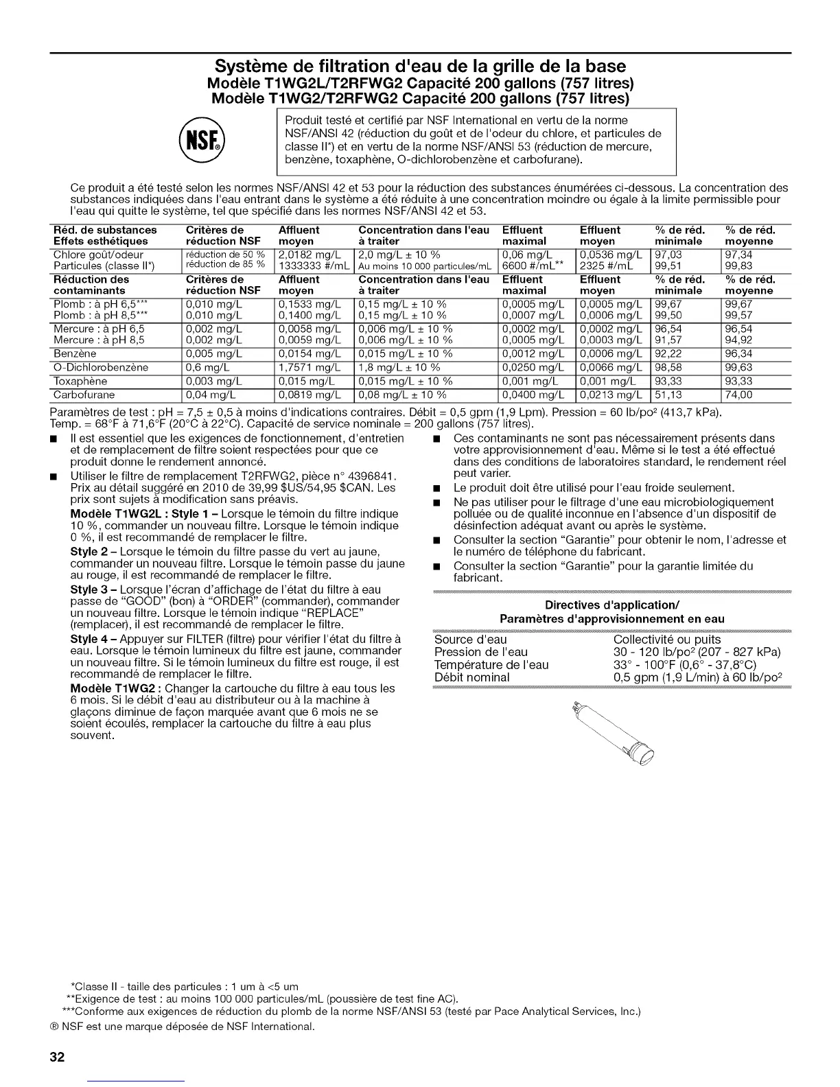 • Utiliser le filtre de remplacement T2RFWG2, piece n° 4396841.