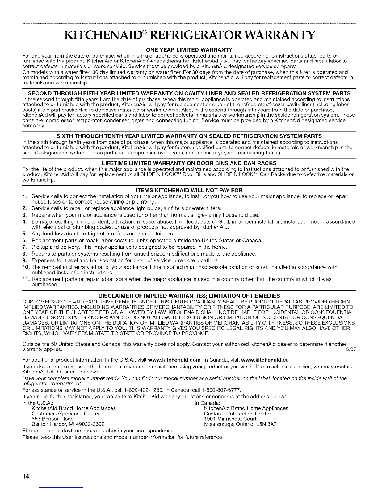 KITCHENAID ®REFRIGERATOR WARRANTY