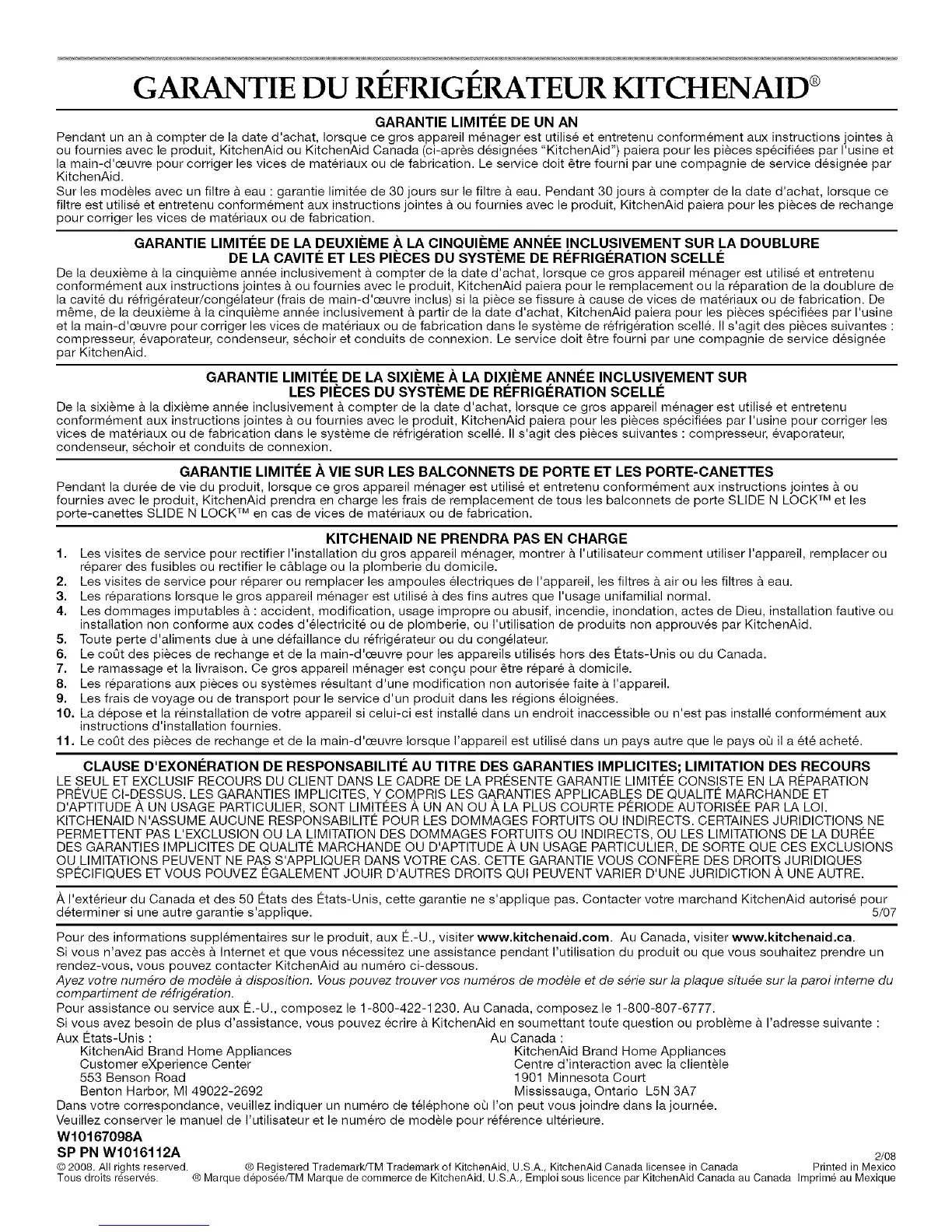 © 2008. All rights reserved. © Registered Trademark/TM Trademarkof KitchenAid, U.S.A., KitchenAid Canada licenseein Canada Printed in Mexico