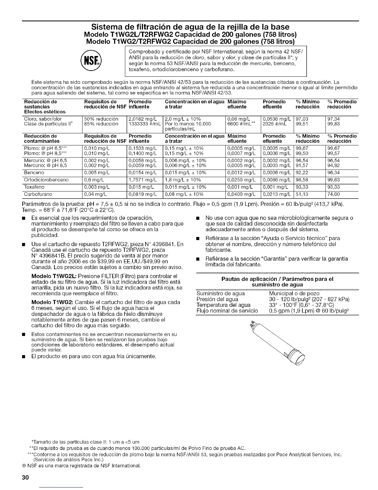 ANSI para la reducci6n de cloro, sabor y olor, y clase de particulas I1"; y