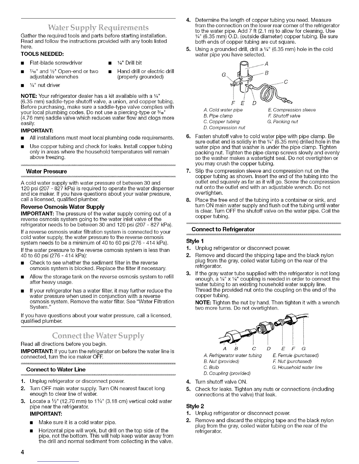 (6.35 mm) saddle-type shutoff valve, a union, and copper tubing.