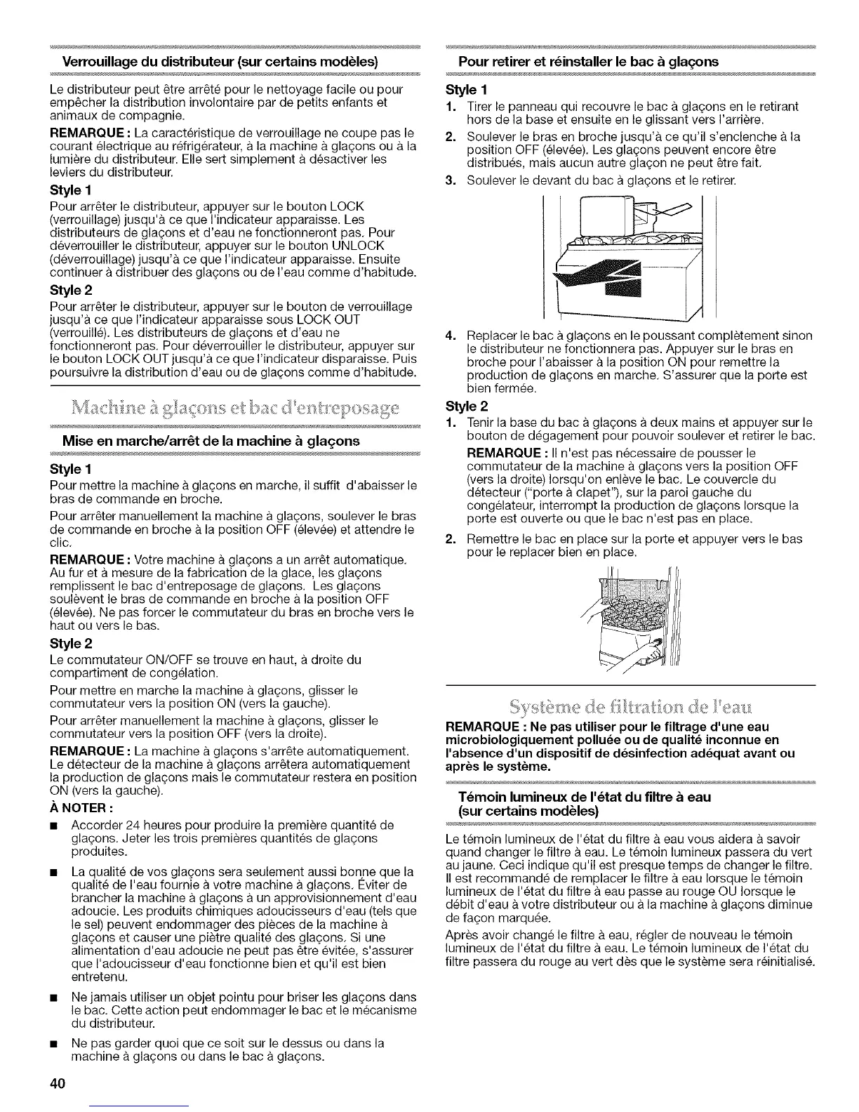 (verrouille). Les distributeurs de glagons et d'eau ne