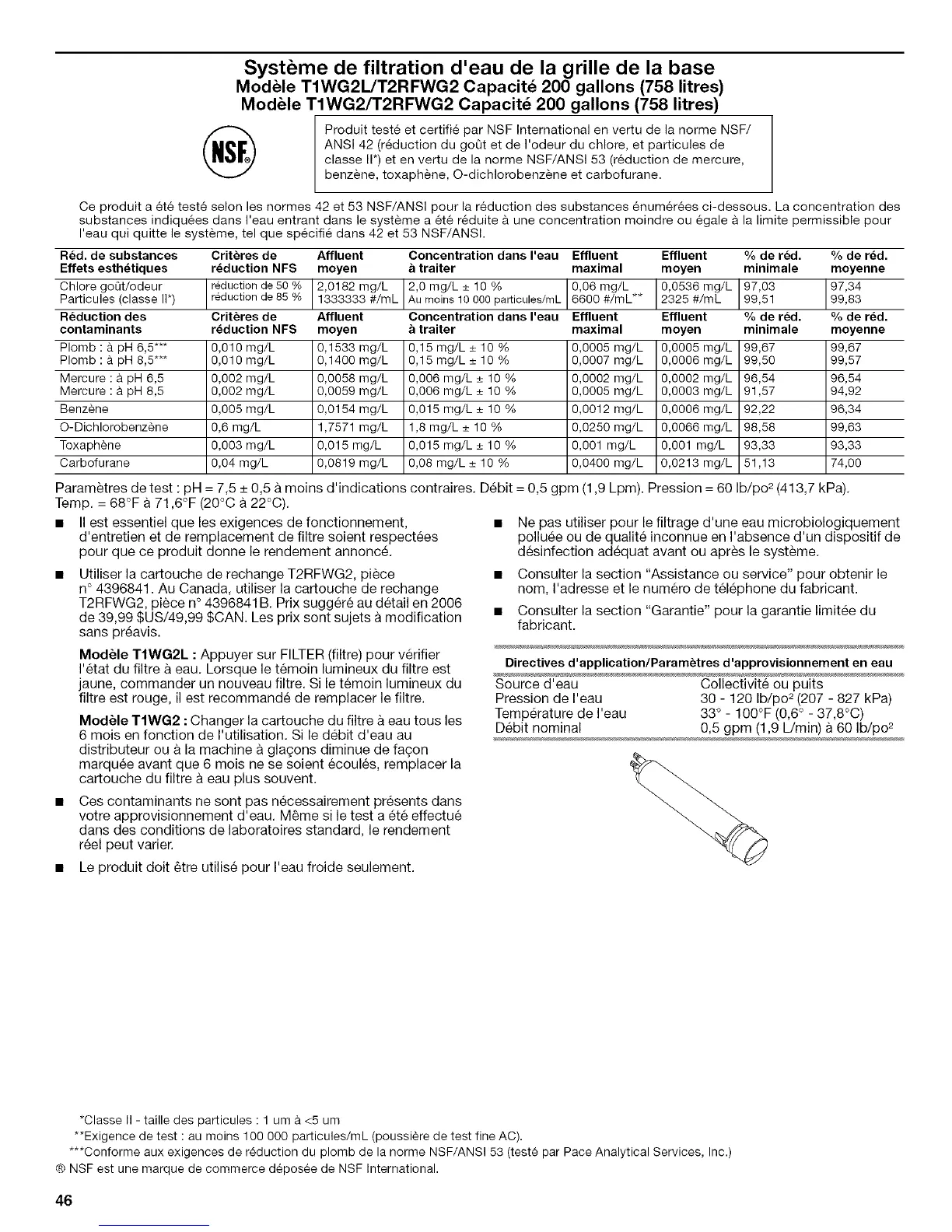 Ce produit a &t& test& selon les normes 42 et 53 NSF/ANSI pour la r&duction des substances 6num&r&es ci-dessous. La concentration des