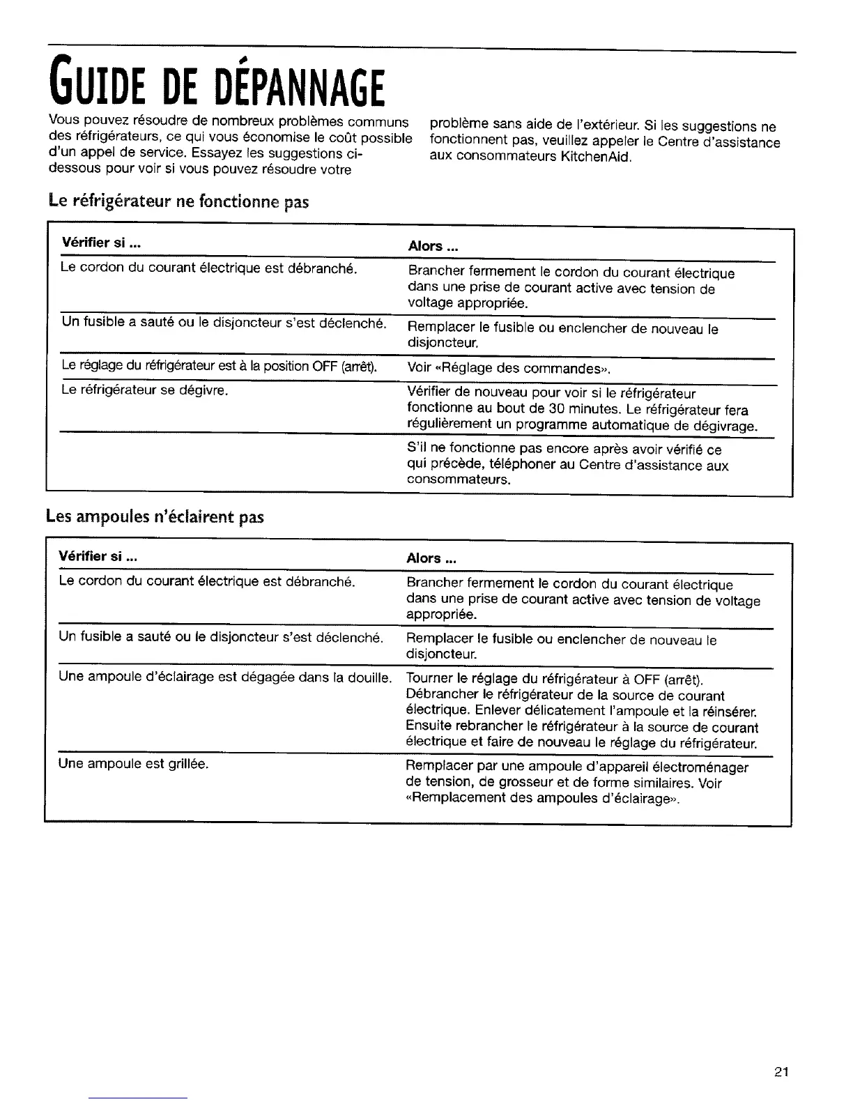 Une ampoule d'eclairage est d6gag6e dans la douille. Tourner le r6glage du r_frig_rateur & OFF (afrO,t).