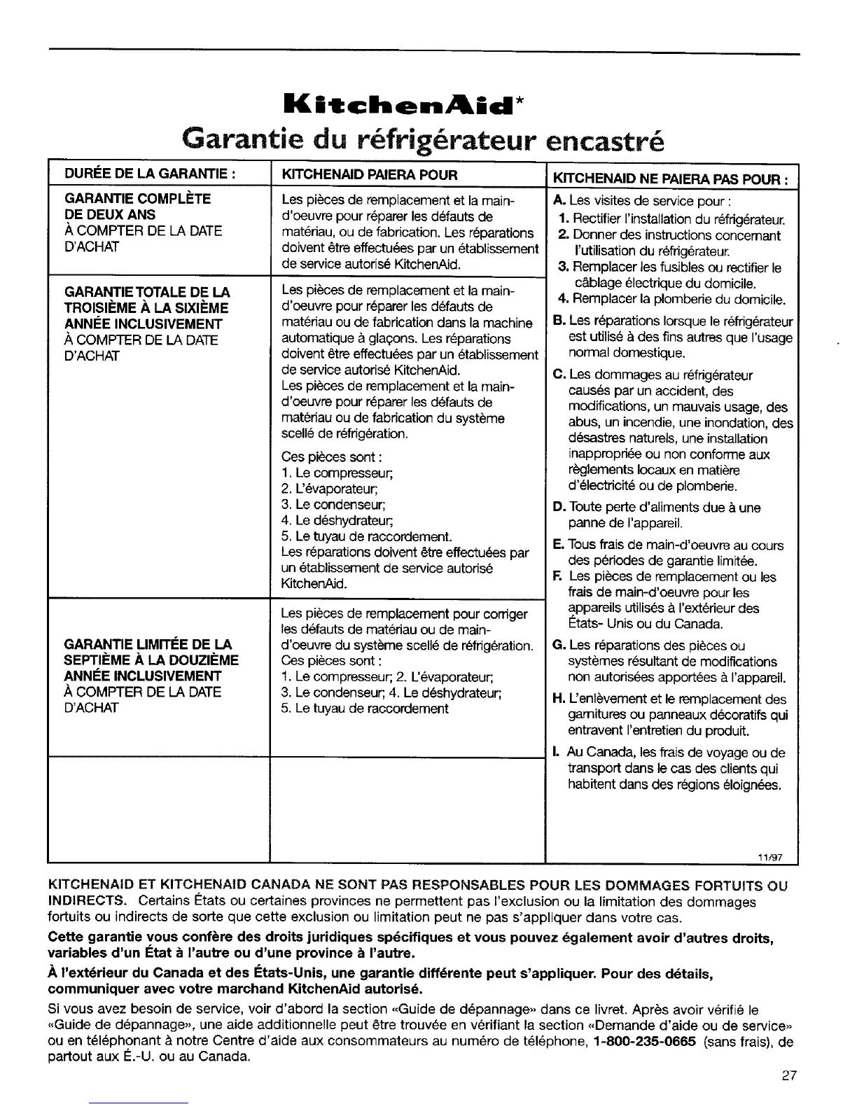 KITCHENAID ET KITCHENAID CANADA NE SONT PAS RESPONSABLES POUR LES DOMMAGES FORTUITS OU