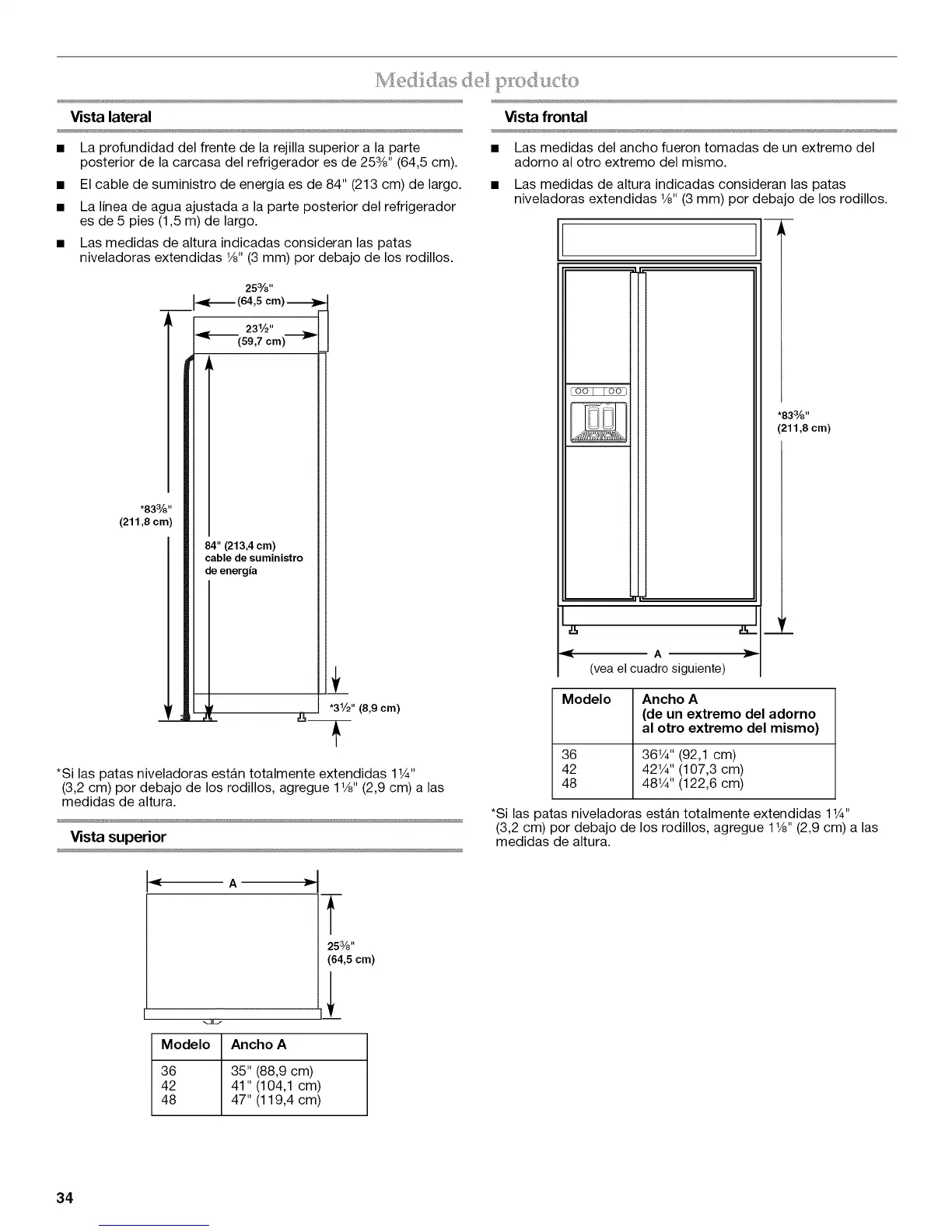 • El cable de suministro de energia es de 84" (213 cm) de largo.