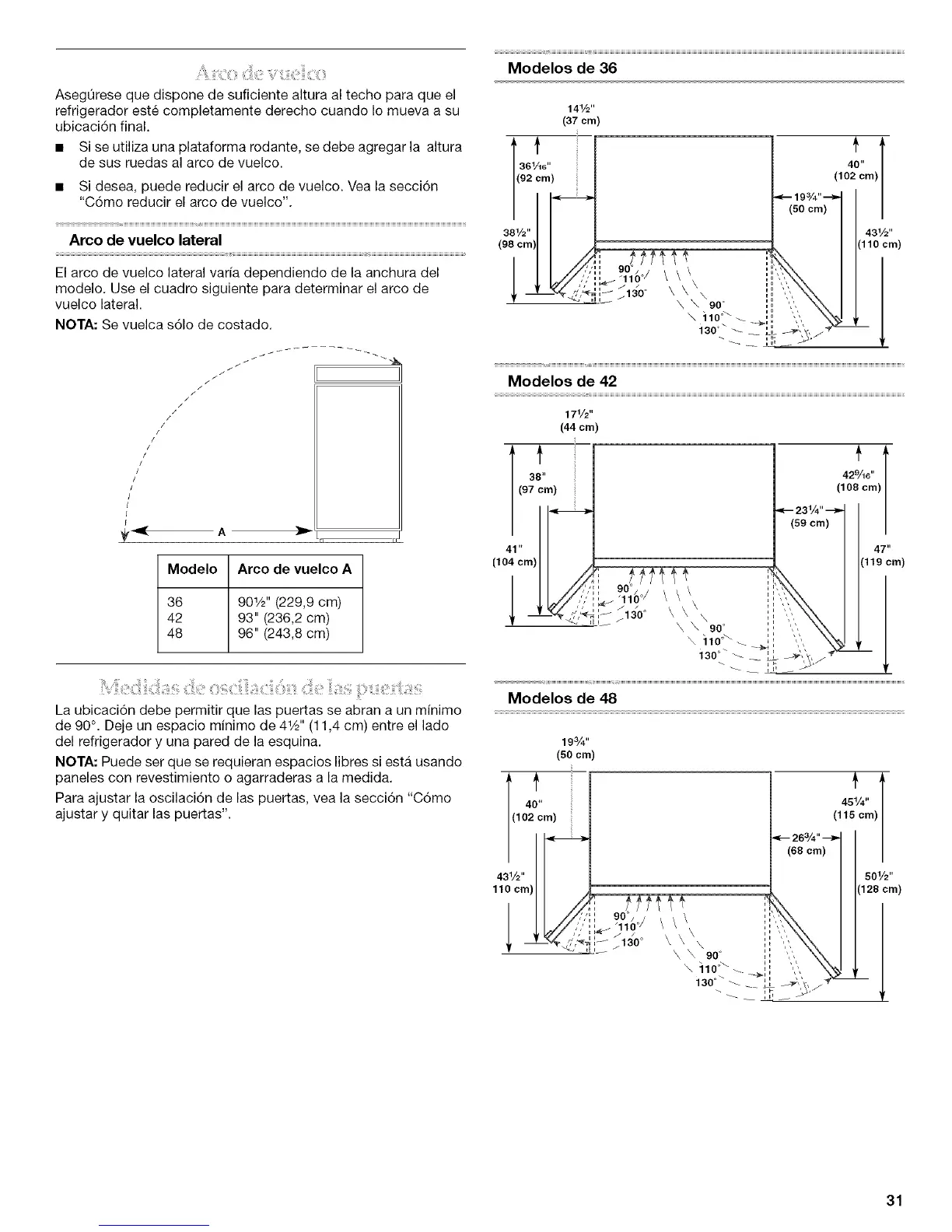 de 90 °. Deje un espacio minimo de 41A" (11,4 cm) entre el lade