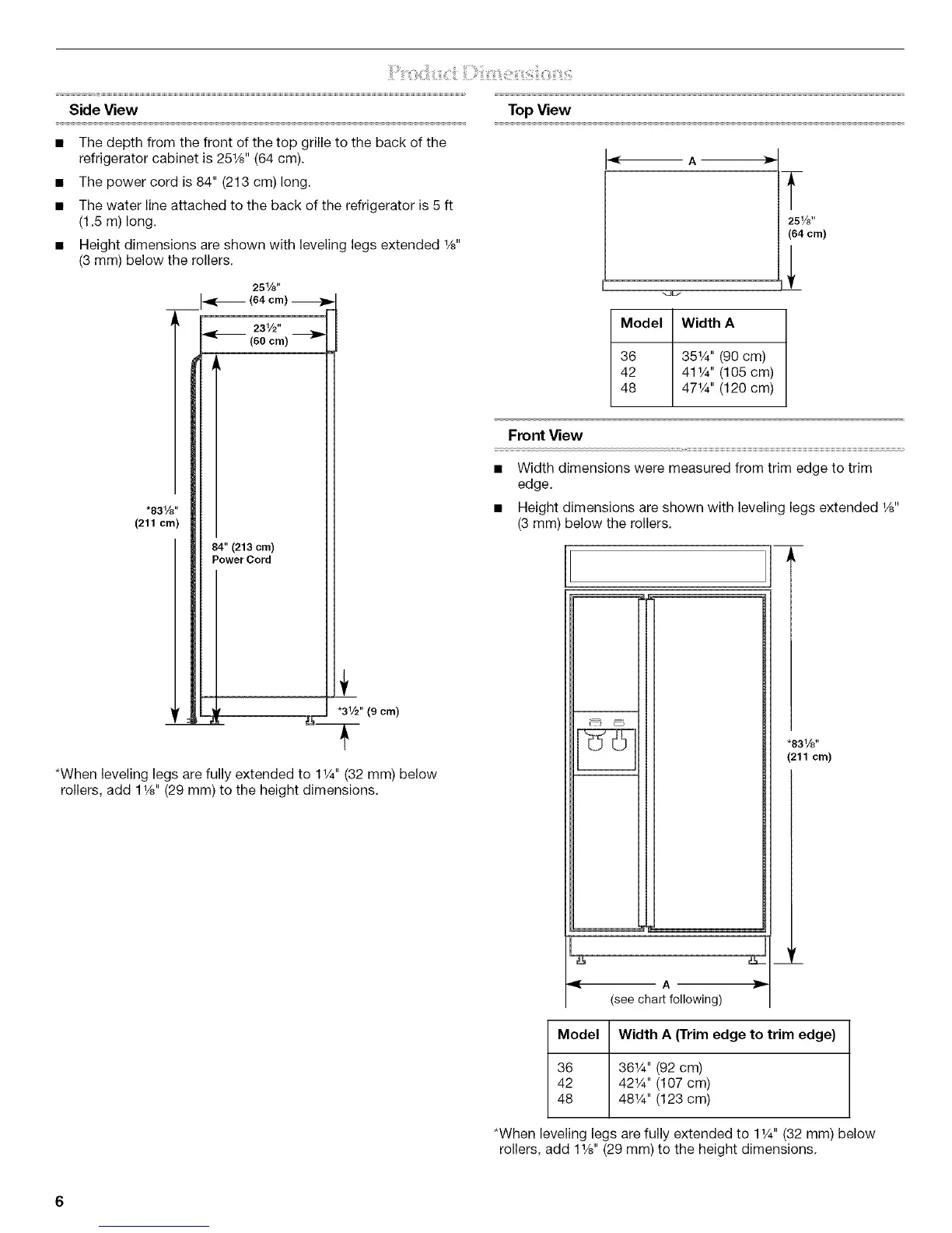 • Height dimensions are shown with leveling legs extended 1/8"