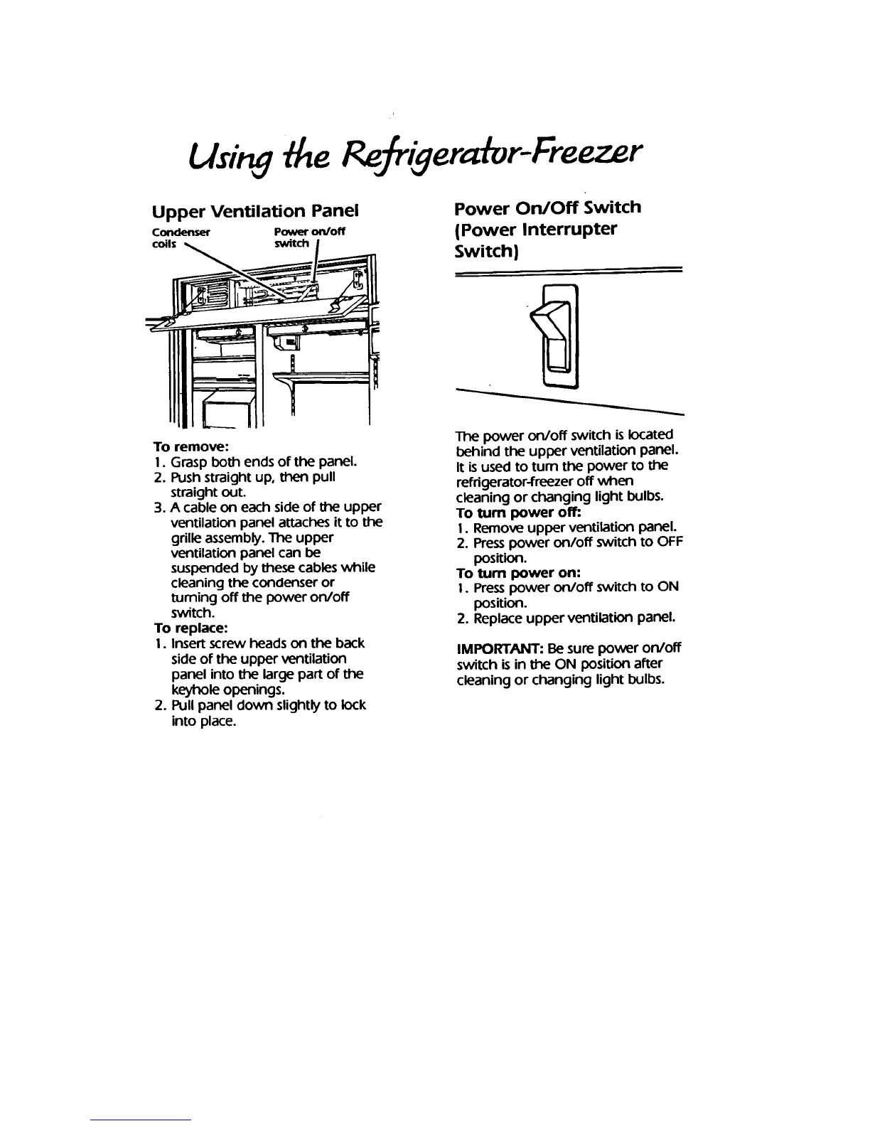KitchenAid KSSS36D - How to Use; Upper Ventilation Panel; Power On;Off Switch (Power Interrupter Switch)
