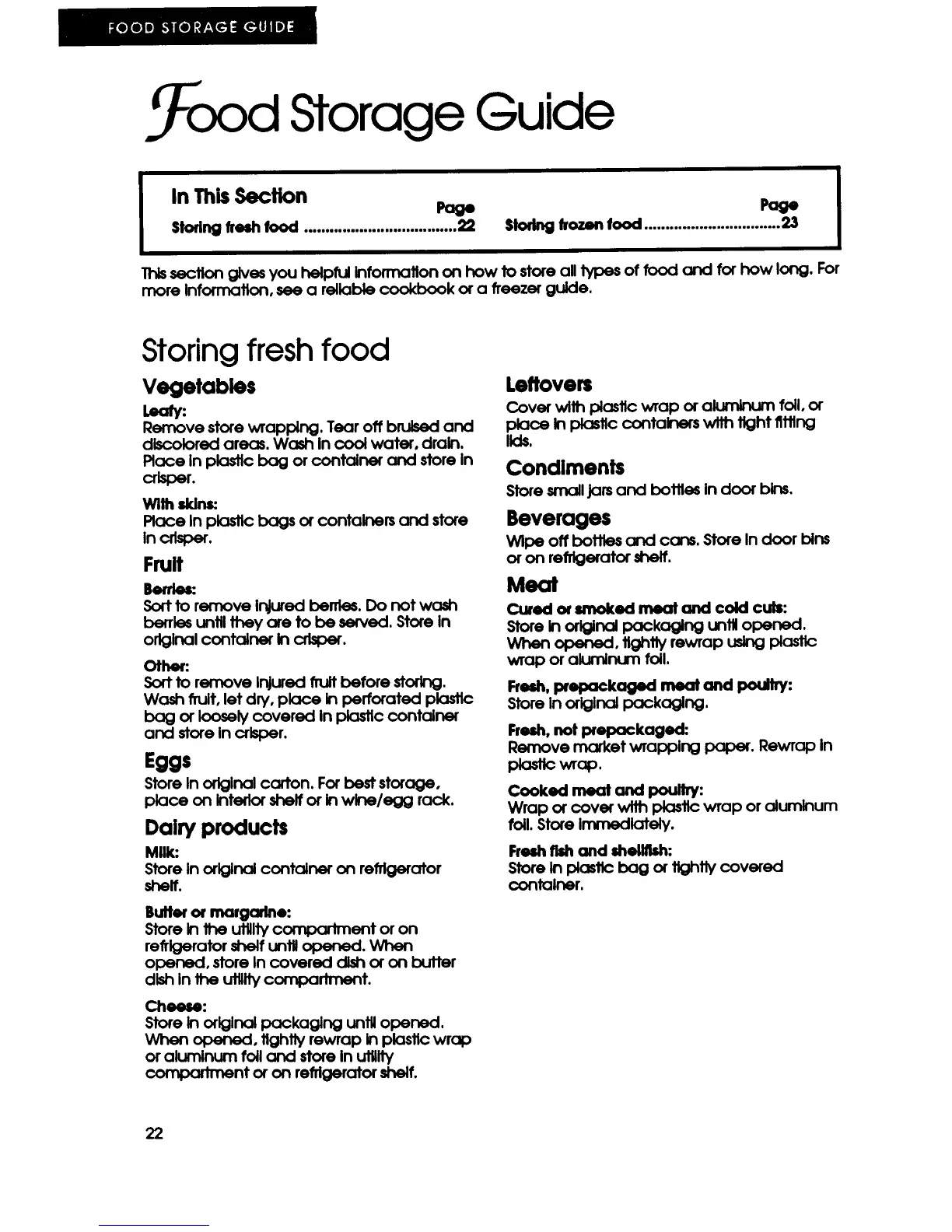 KitchenAid KSSS42M - Food Storage Guide; Storing Fresh Food; Vegetables; Fruit