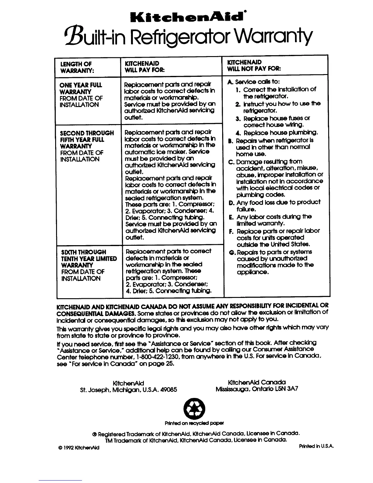 KitchenAid KSSS42M - KitchenAid Refrigerator Warranty; Warranty Coverage Details