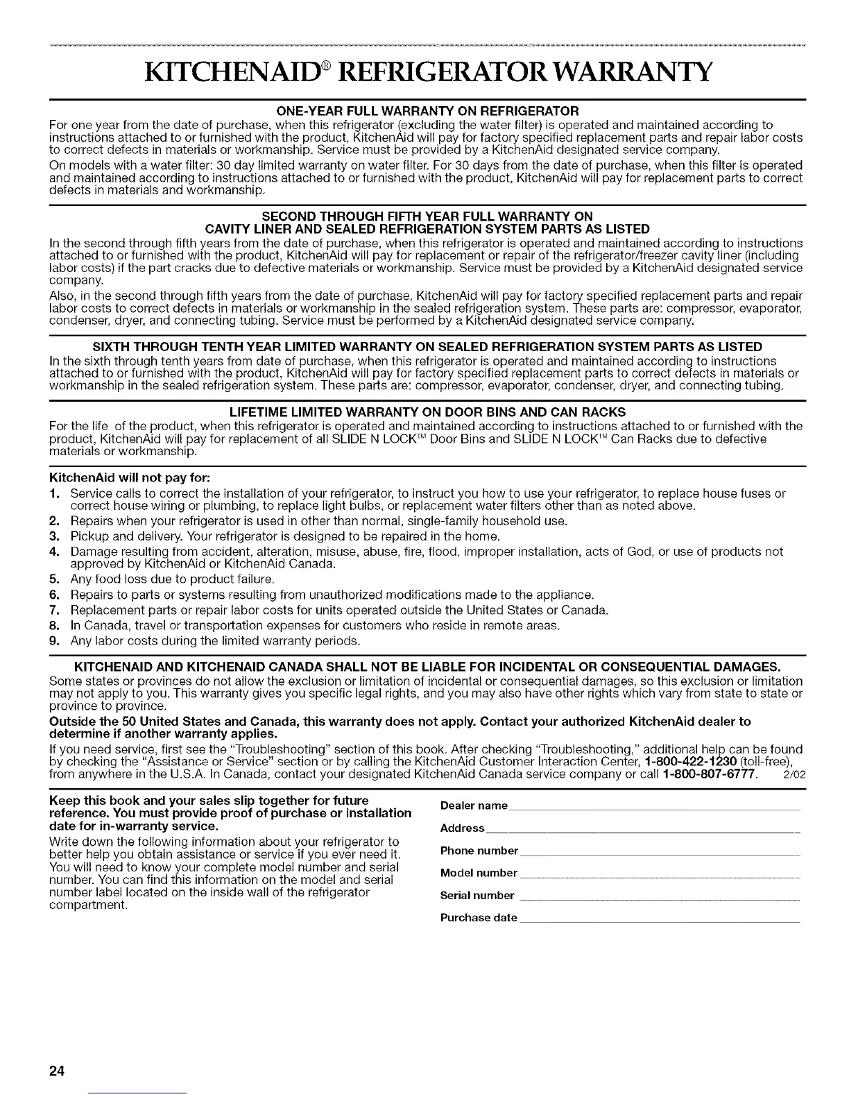 from anywhere in the U.S.A. In Canada, contact your designated KitchenAid Canada service company or call 1-800-807-6777. 2/02